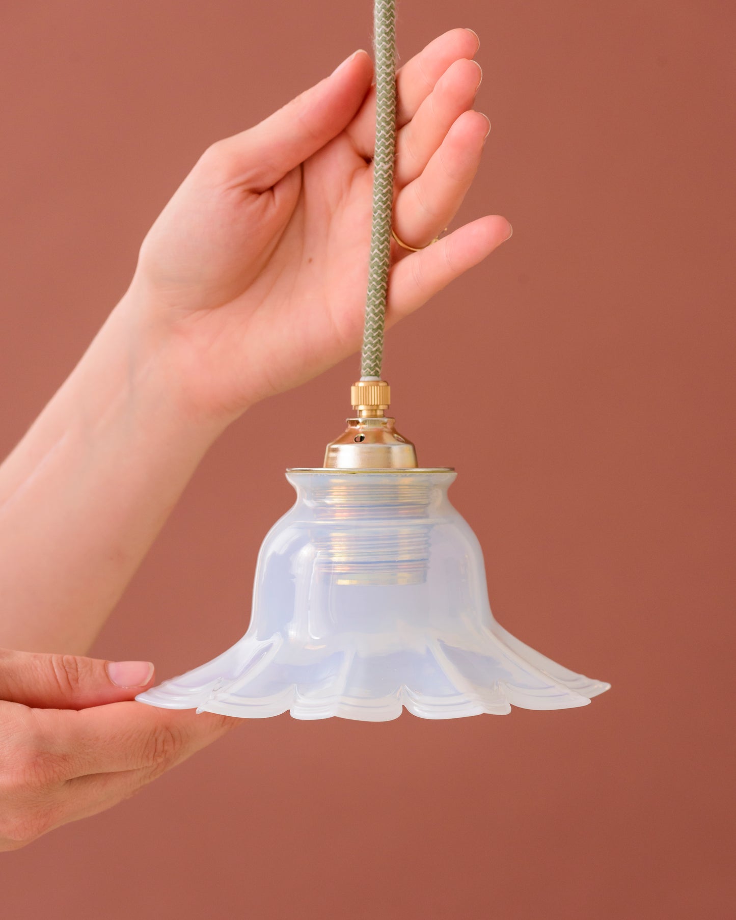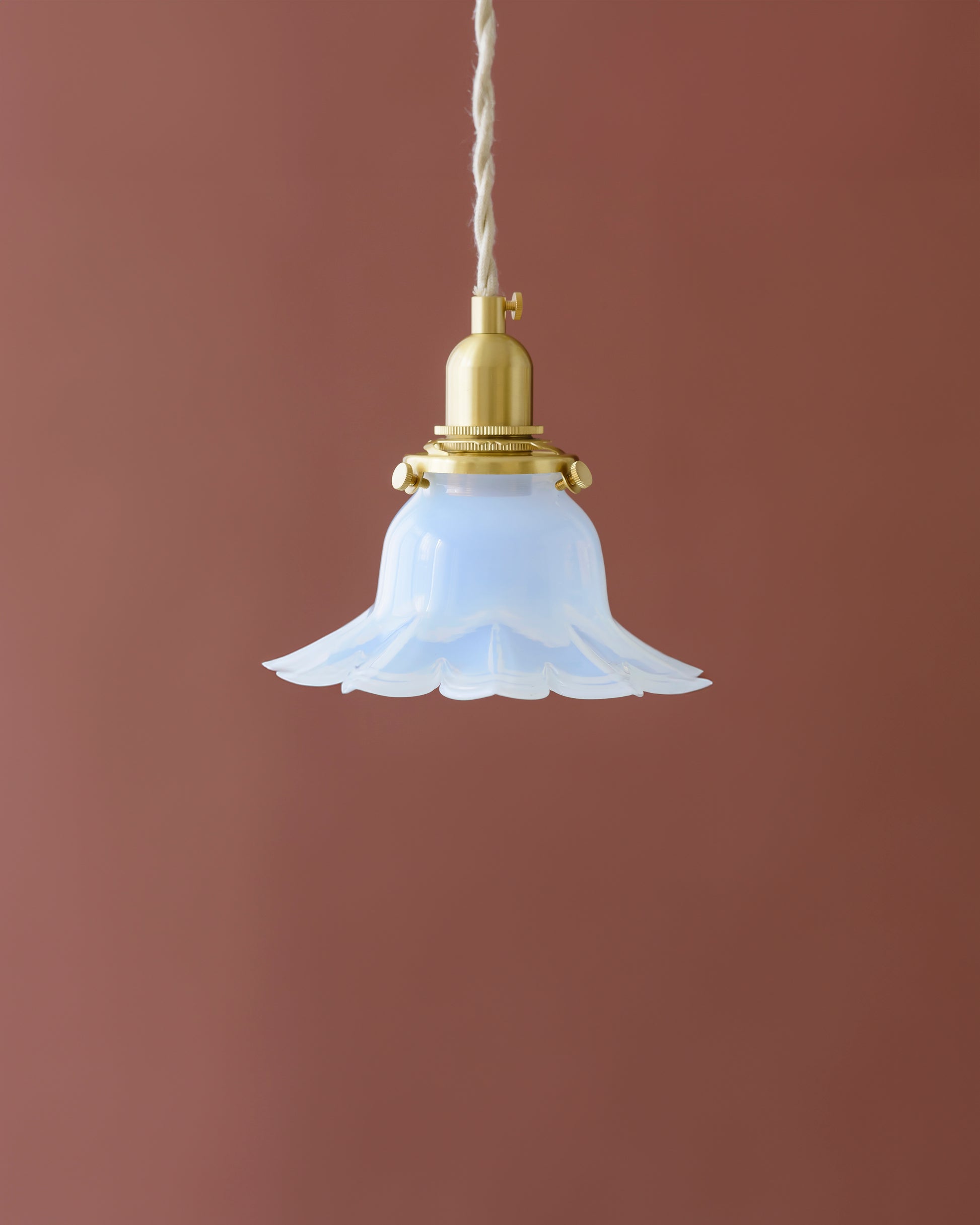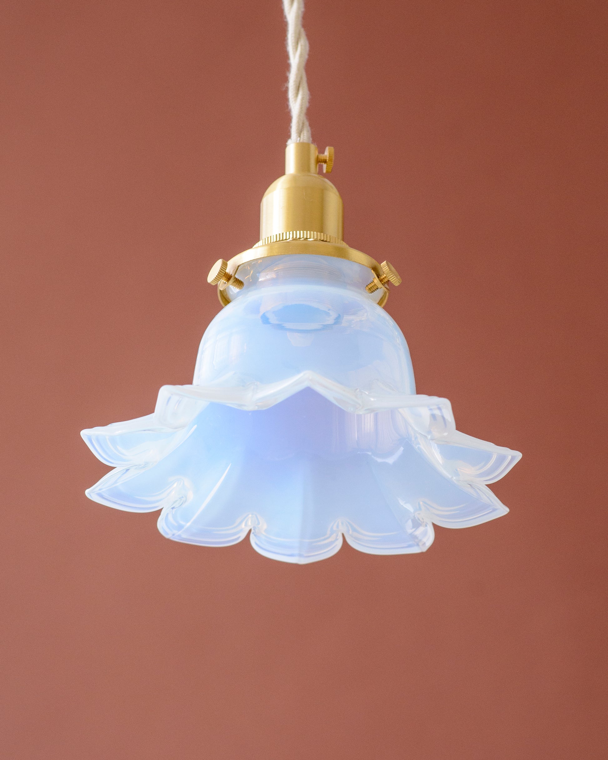Amélie heeft een zachtblauwe tint en een vorm die lijkt op bloemblaadjes. Het opaline glas zorgt voor een warme, zachte lichtverdeling. Dit lambje past perfect in een romantische of stijlvolle kamer.