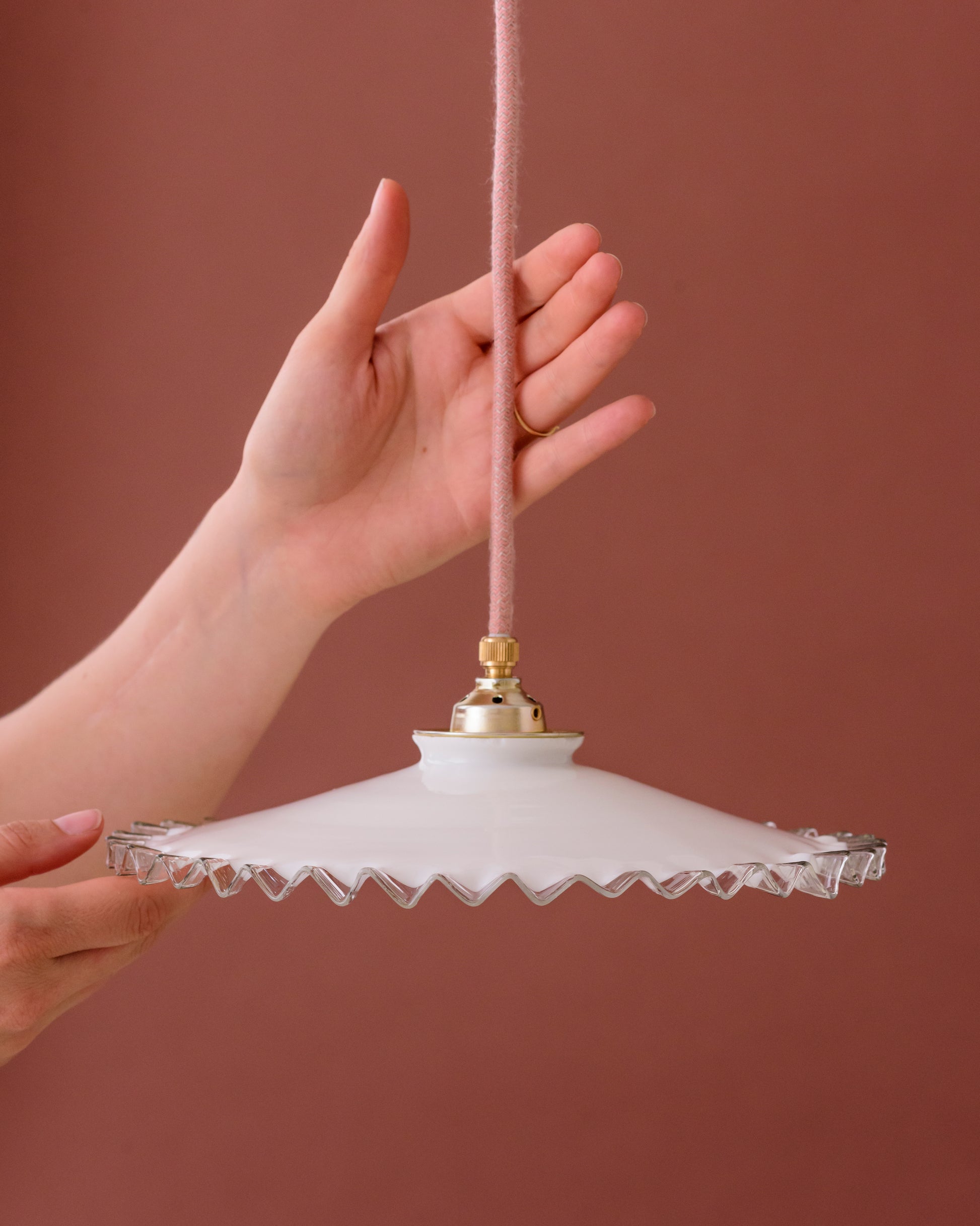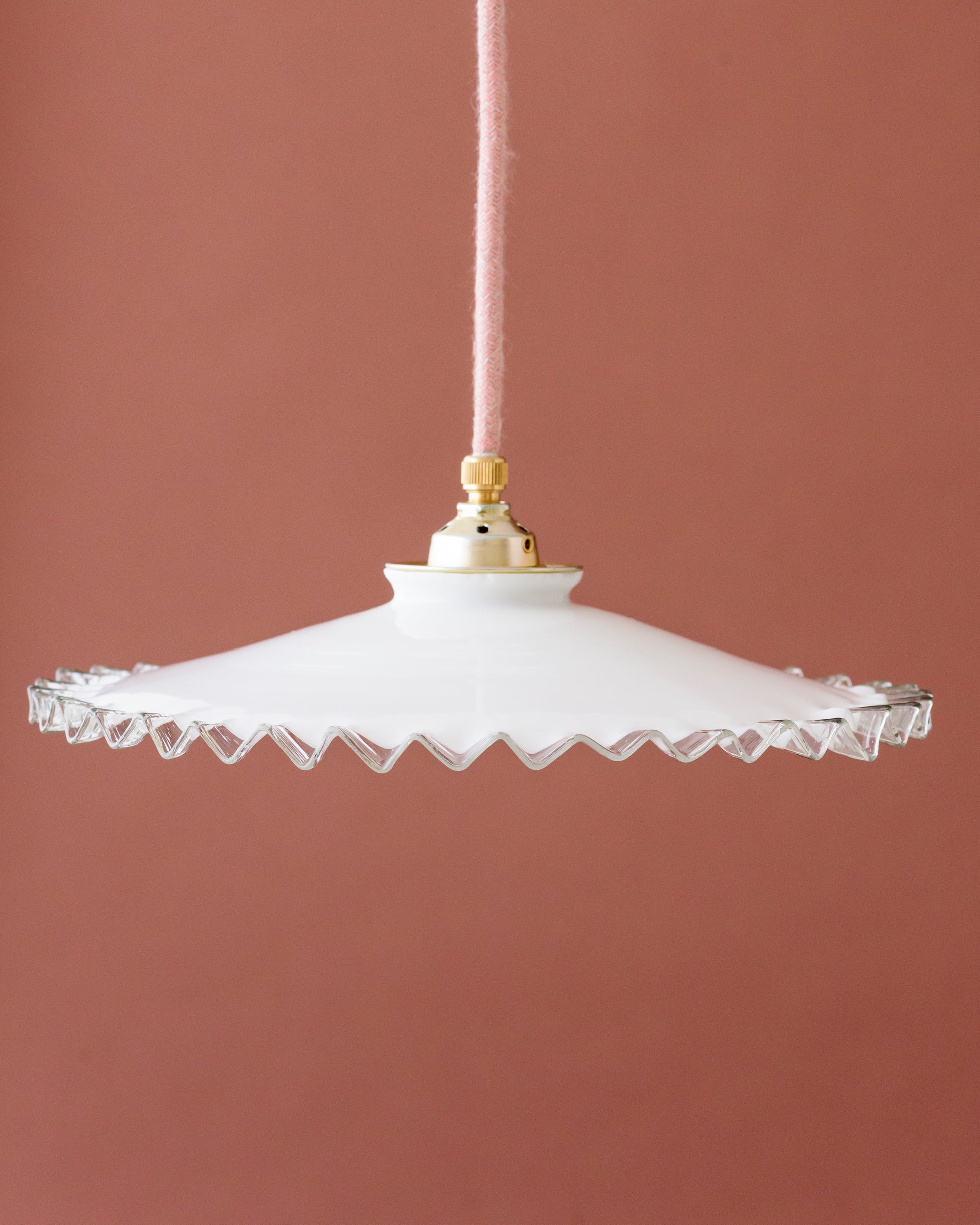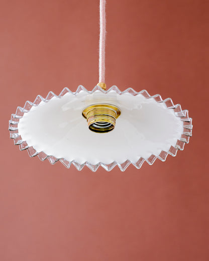 Amira is een elegante lampenkap met een brede, platte vorm en een zigzaggende rand van helder glas. Het contrast tussen het witte opaline glas en de transparante rand geeft een verfijnde uitstraling. Deze kap verspreidt zacht licht en is perfect voor boven een eettafel of in een hal.