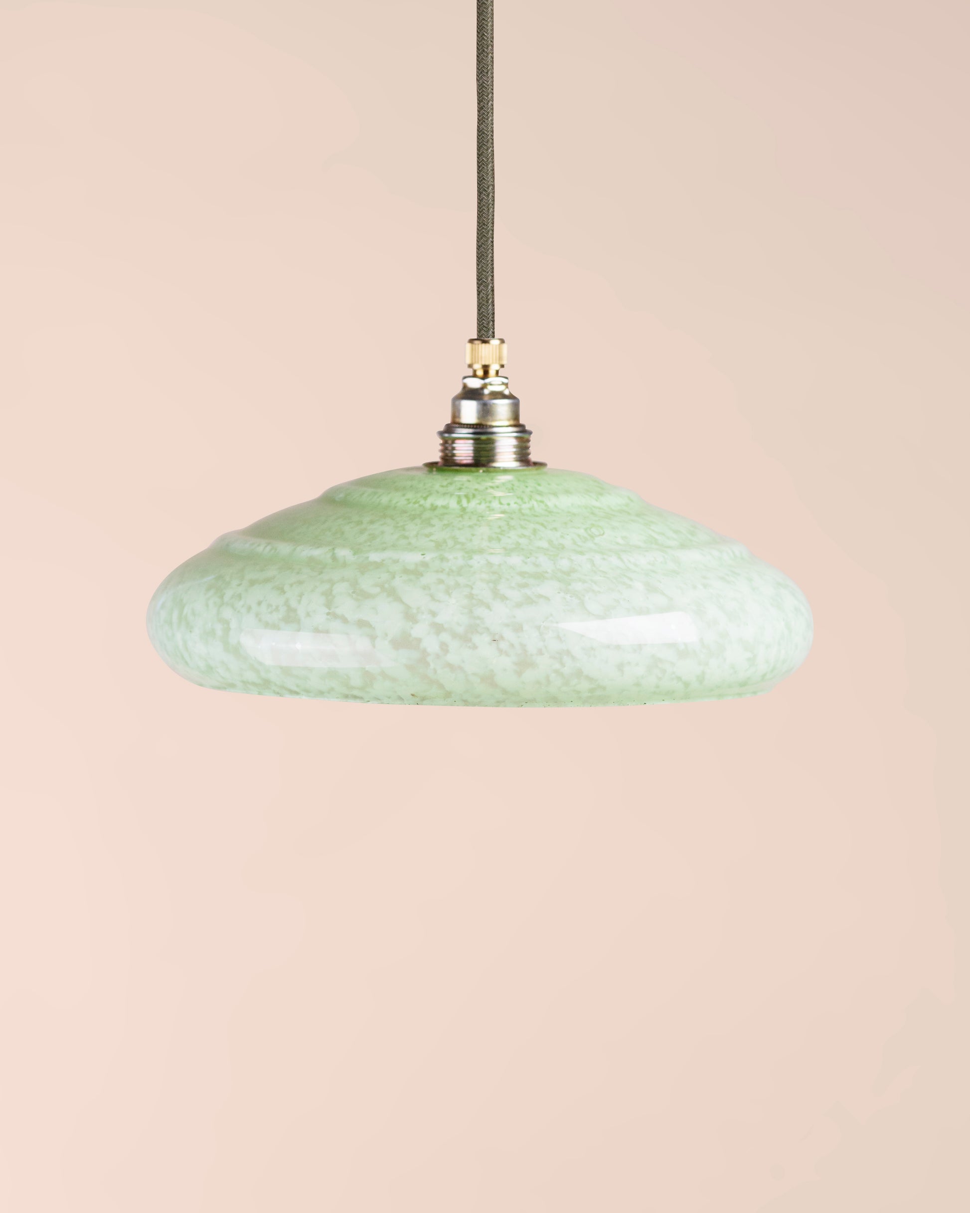 Het lambje Ariane is een verfijnd exemplaar uit de jaren 30, vervaardigd uit Clichy-glas met een subtiele groene marmering. De zachte, organische vorm en unieke glastextuur geven het een rustgevende en elegante uitstraling. Dankzij de brede kap verspreidt dit lambje een warm en diffuus licht, ideaal voor een sfeervolle ambiance. Dit bijzondere ontwerp komt prachtig tot zijn recht boven een eettafel, in een hal of als stijlvol accent in een vintage interieur.