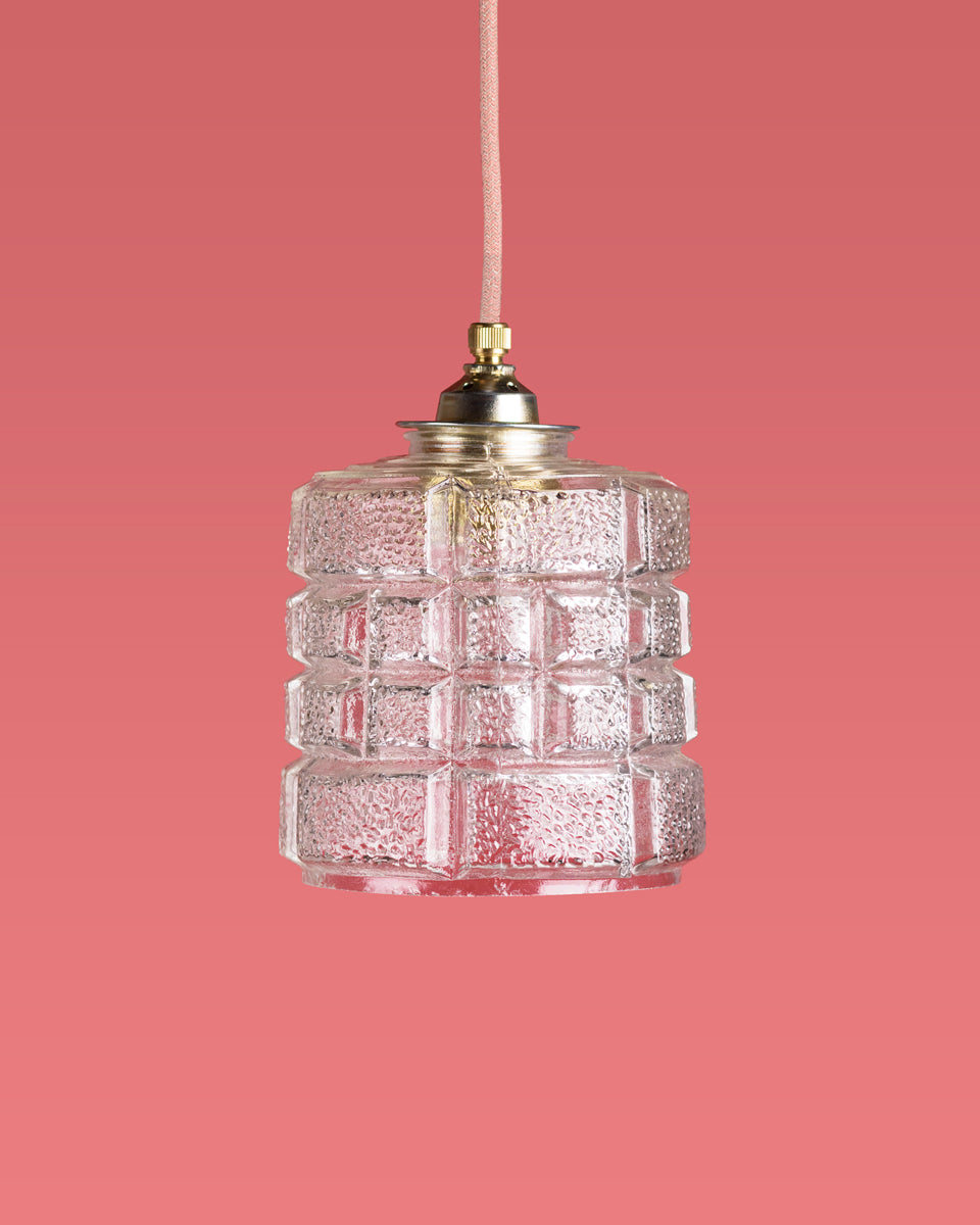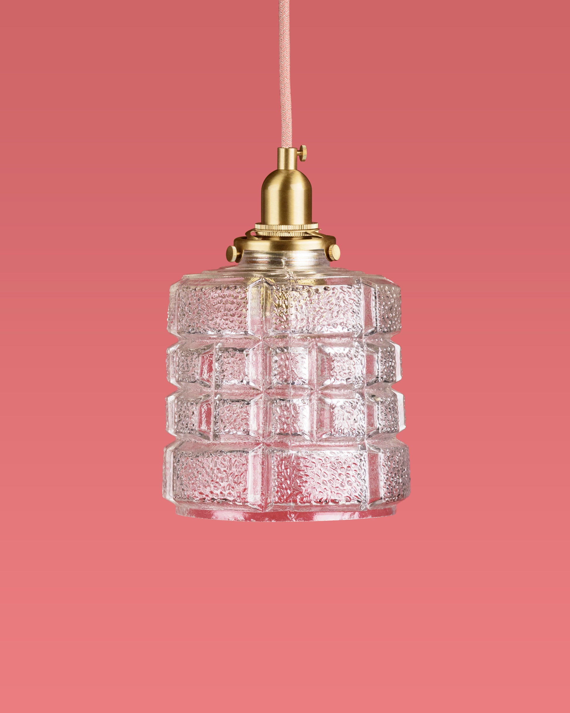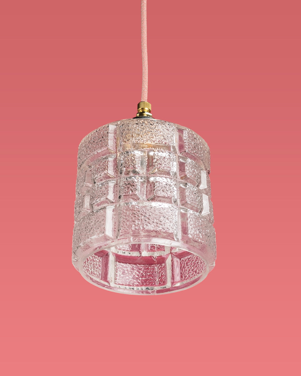 Het lambje Bente is een stoer en grafisch ontwerp uit de jaren 70, met een duidelijke kubus-structuur en levendige textuur in helder glas. Het patroon vangt het licht op verrassende wijze en zorgt voor een dynamisch spel van schaduw en schittering. Bente is een uitgesproken karakter en voelt zich thuis in een modern interieur met vintage elementen, boven een werkhoekje of als ritmisch accent in een gang of hal.