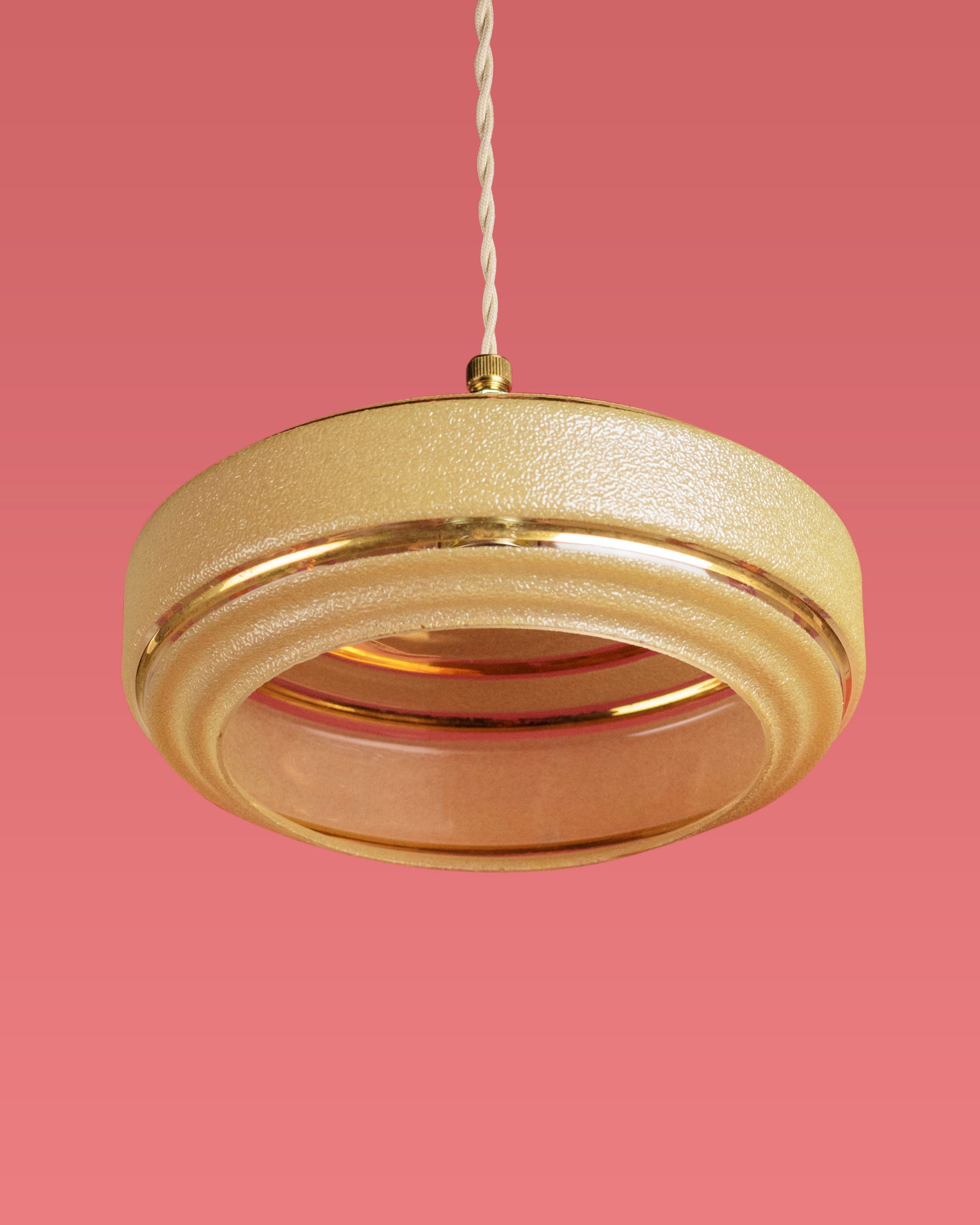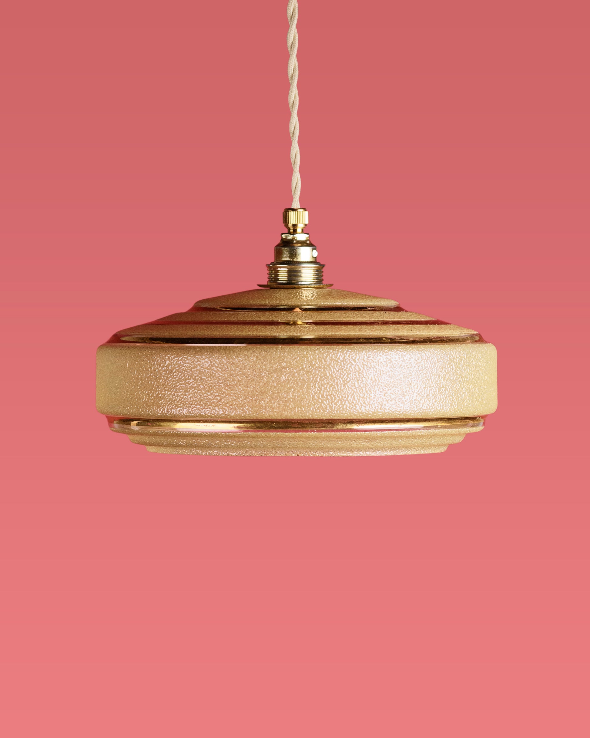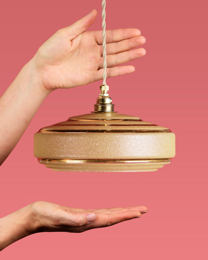Het lambje Bernadette is een prachtig voorbeeld van Art Deco-design uit de jaren 30. De gelaagde, schijfvormige structuur en de subtiele gouden accenten geven het een luxe en geometrische uitstraling. Het gesuikerde glas zorgt voor een verfijnde textuur en een zachte, warme lichtverspreiding. Dit lambje straalt elegantie en klasse uit en komt perfect tot zijn recht boven een eettafel, in een hal of als sfeervol accent in een retro-interieur.