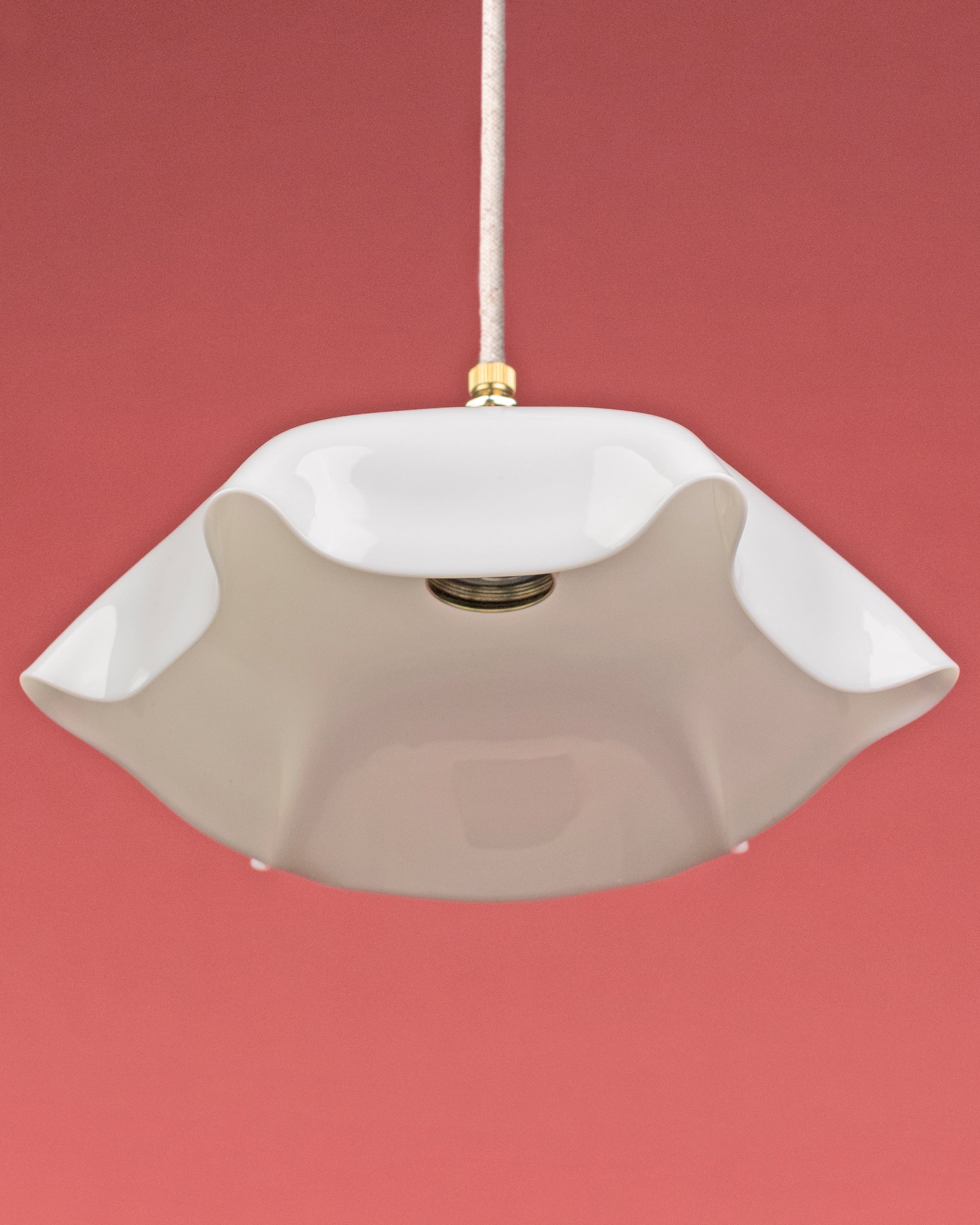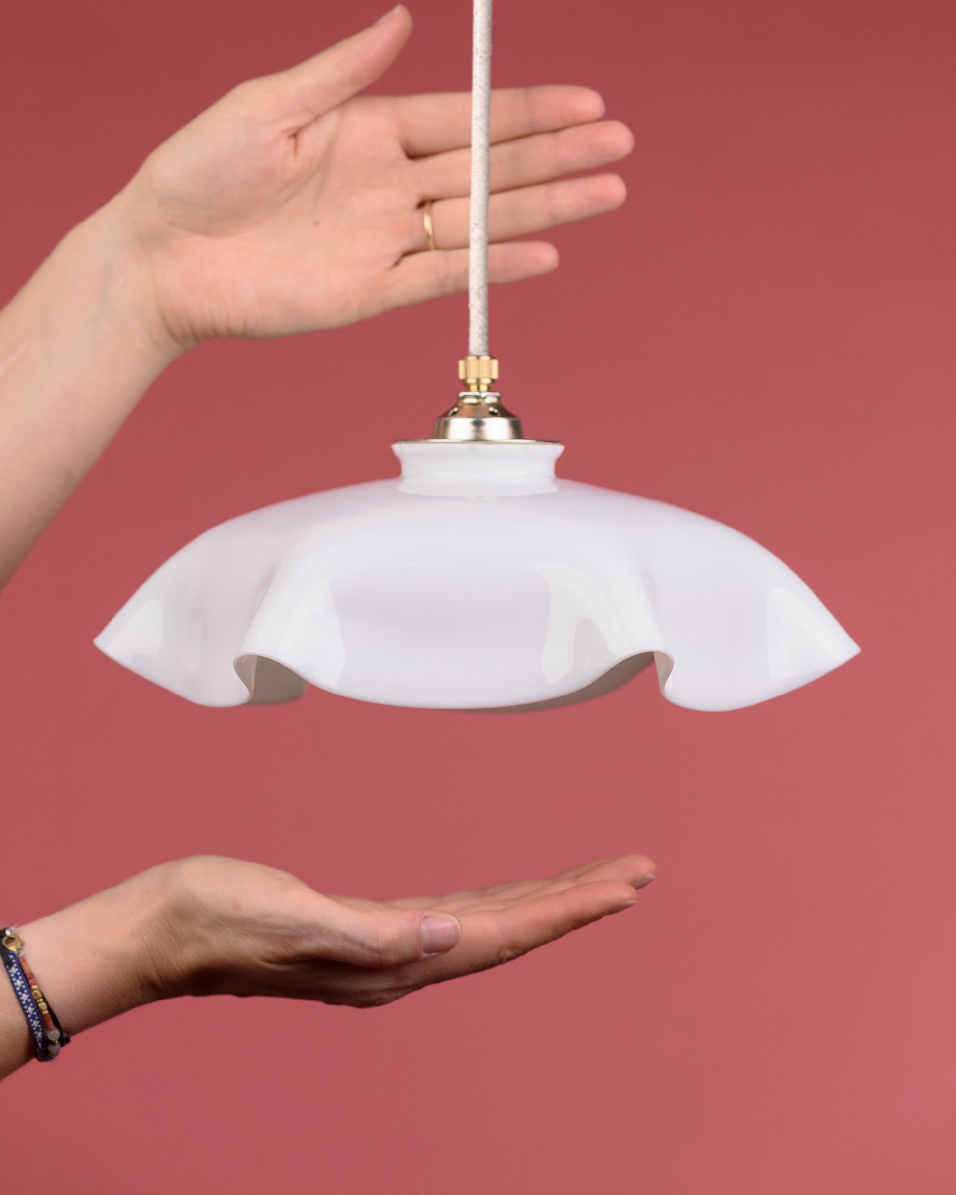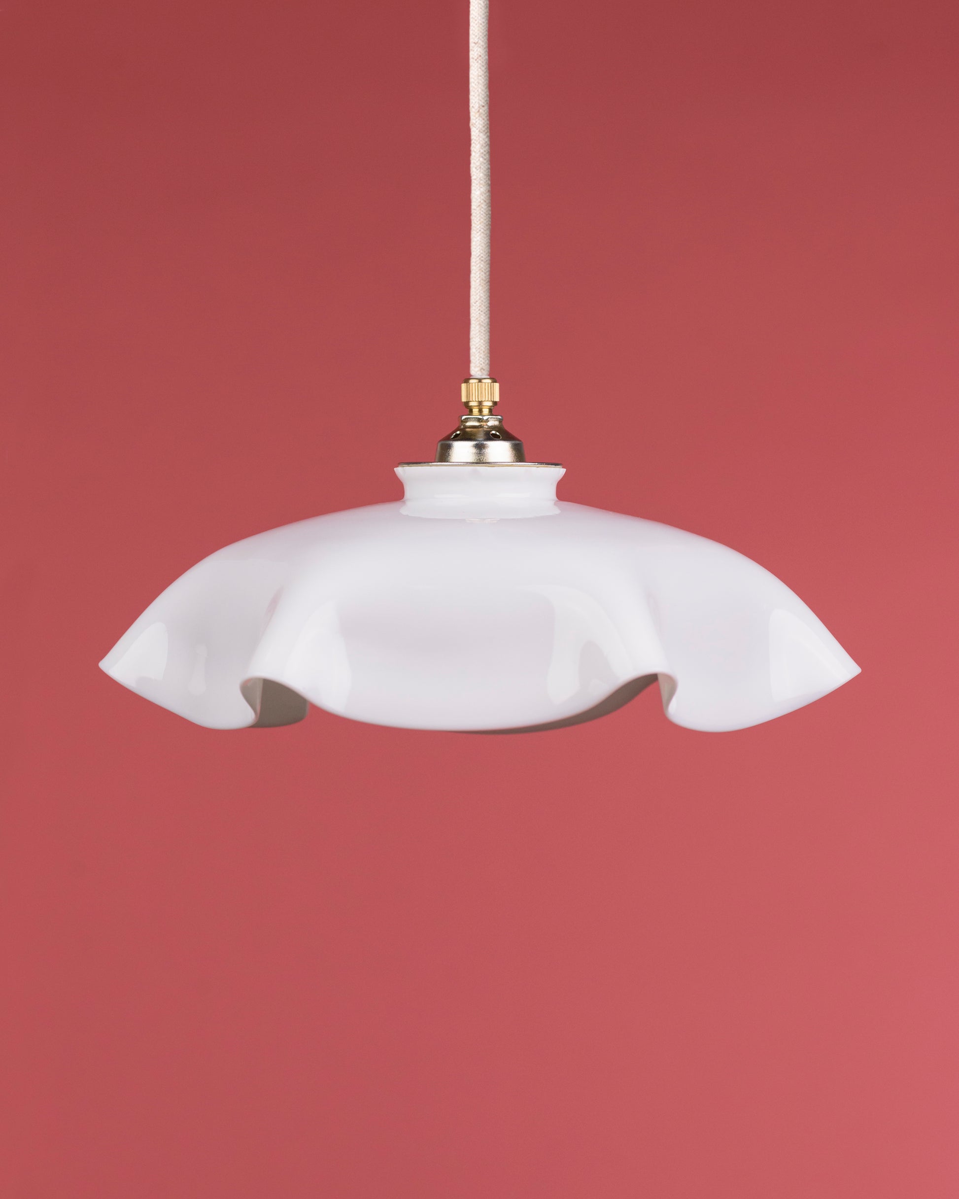Het lambje Clarisse brengt een vleugje romantiek in elk interieur met haar elegante vorm en sprankelend witte glas. De licht golvende randen geven dit lambje een speels karakter, perfect voor boven een eettafel of in een woonkamer.