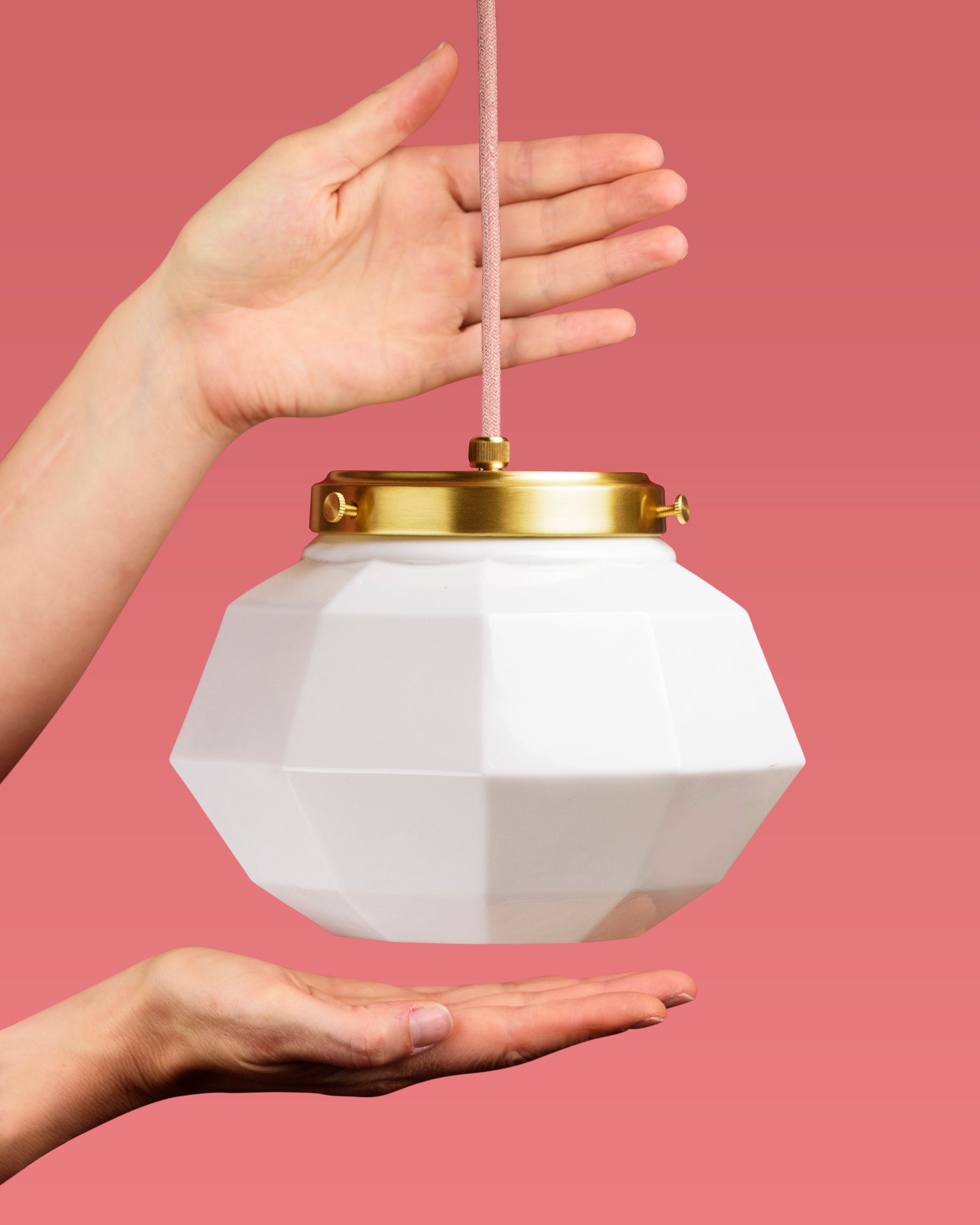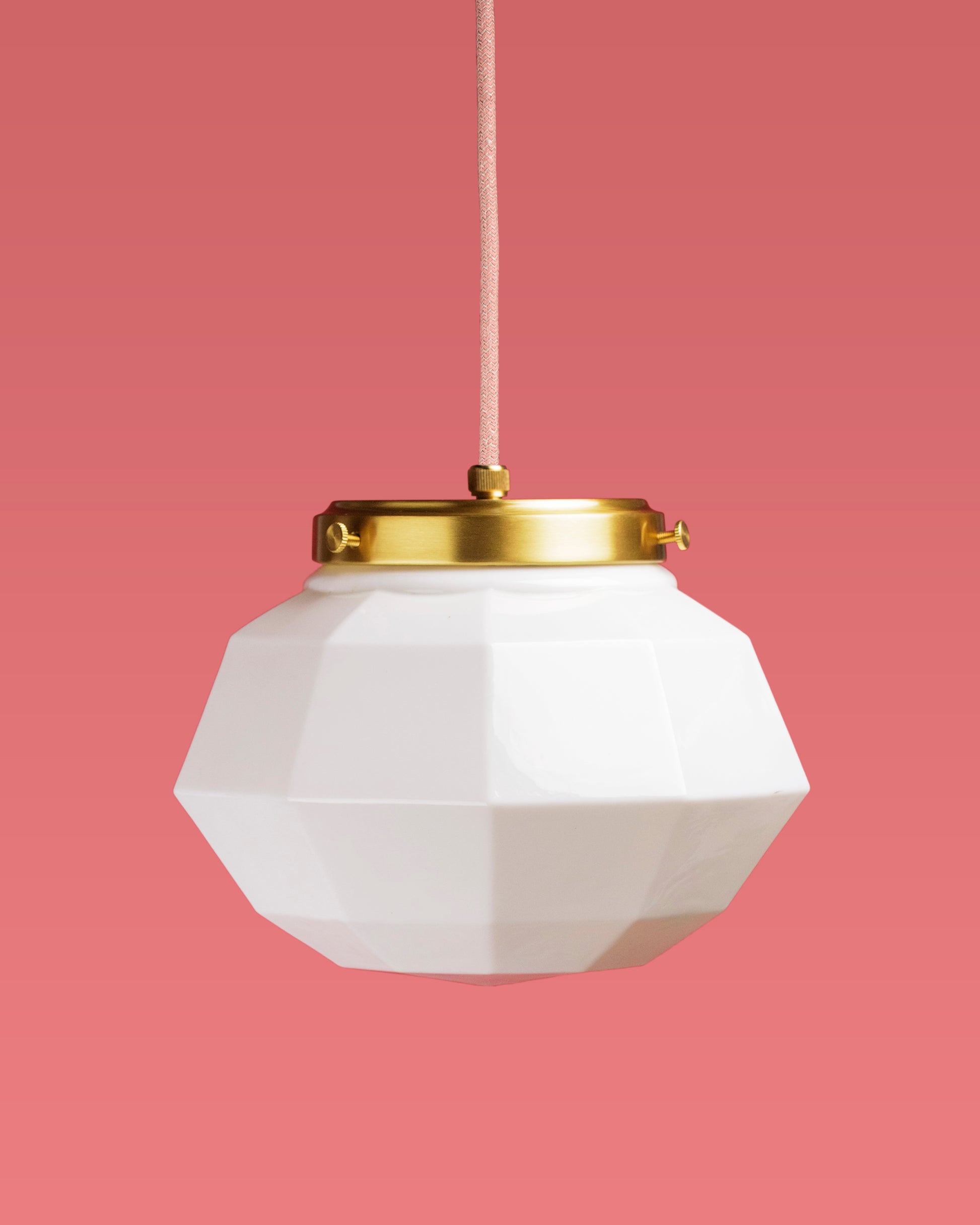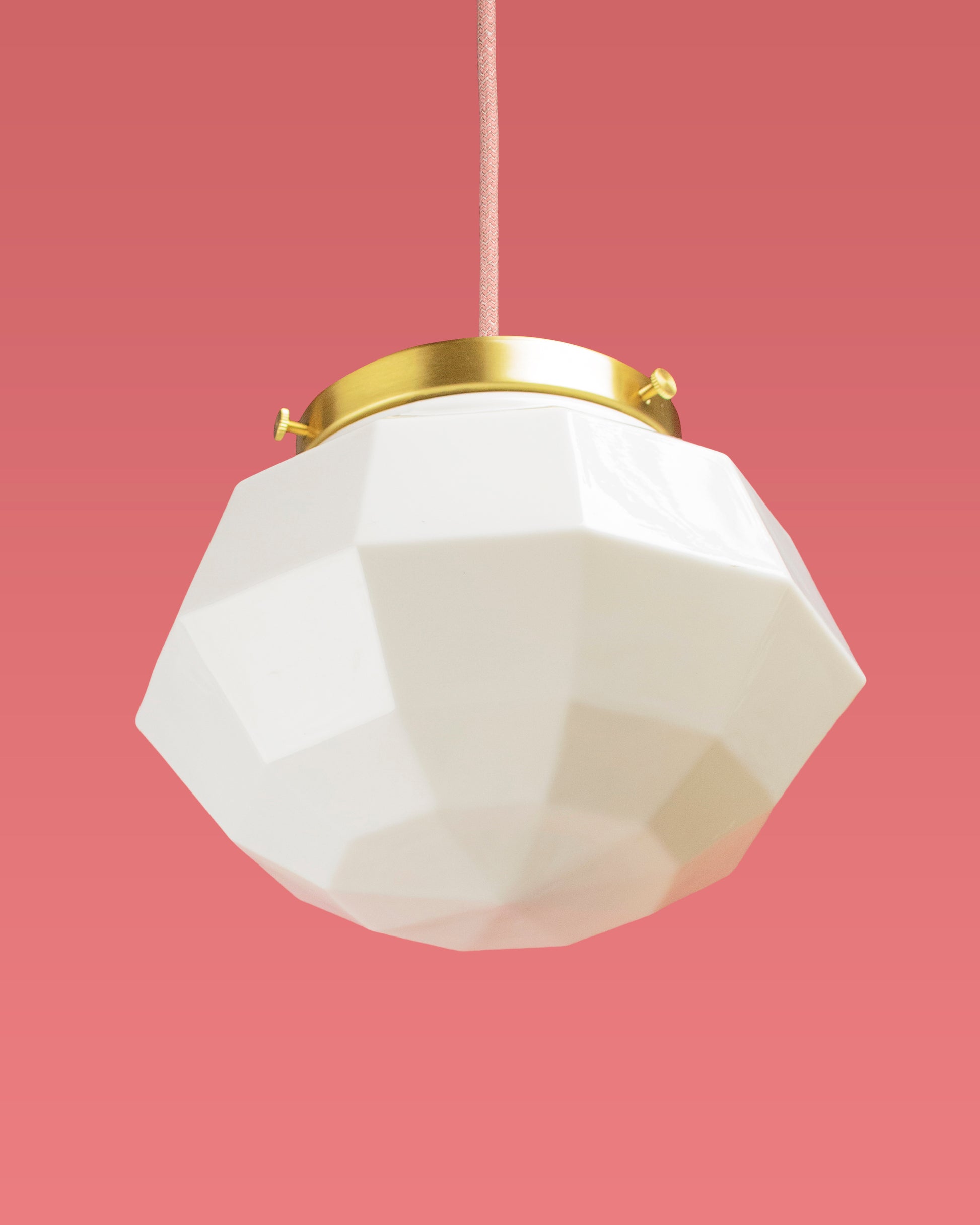Het lambje Élise is een prachtig geometrisch ontwerp uit de jaren 30, waarin Art Deco-invloeden duidelijk terugkomen. De facetvormige structuur geeft het een moderne en verfijnde uitstraling, terwijl het opaline glas zorgt voor een zachte en diffuse lichtspreiding. De messing details versterken de luxe uitstraling, waardoor dit lambje een stijlvolle toevoeging is aan een klassiek of modern interieur. Perfect voor boven een eettafel, in een hal of als sfeervol accent in een woonruimte.