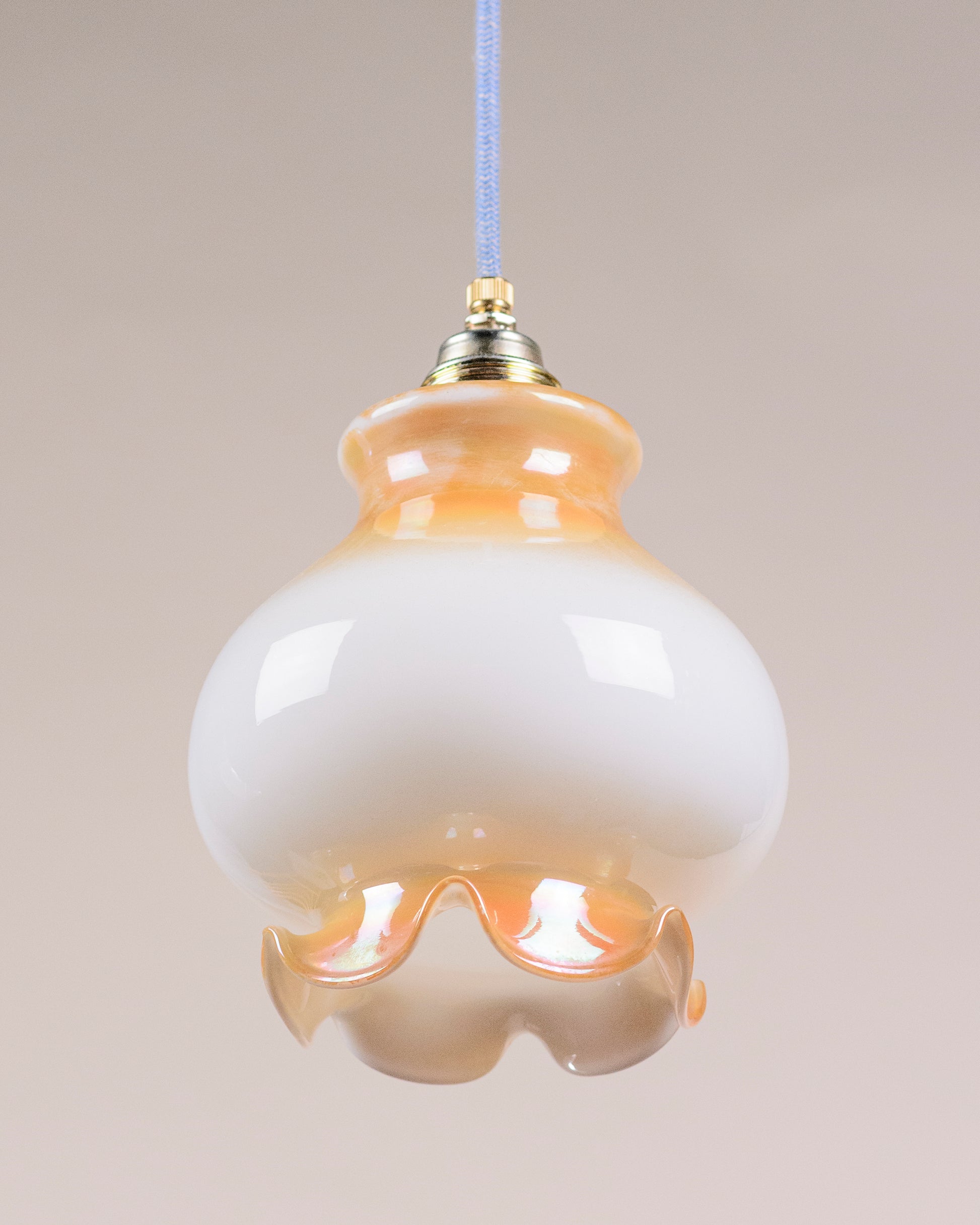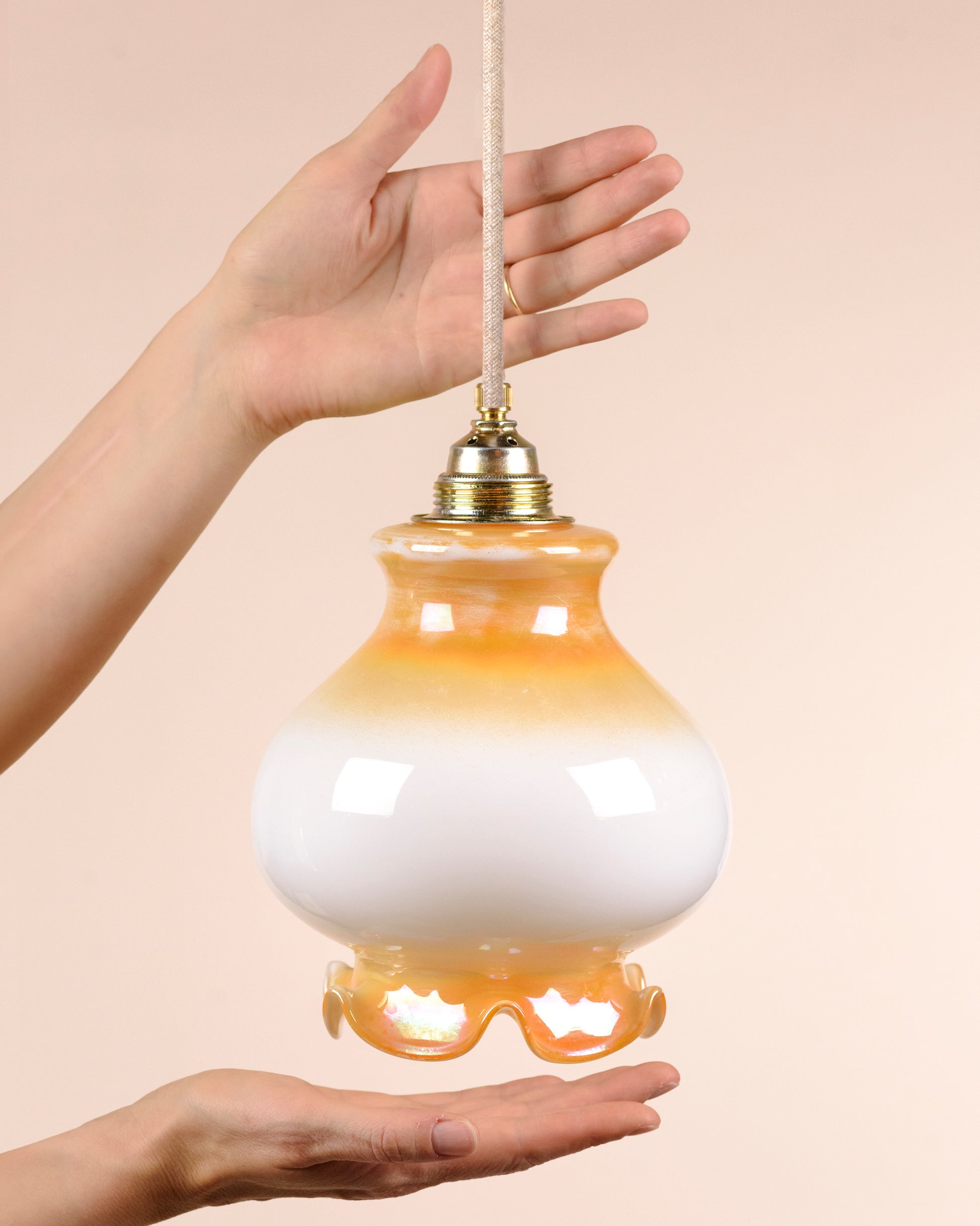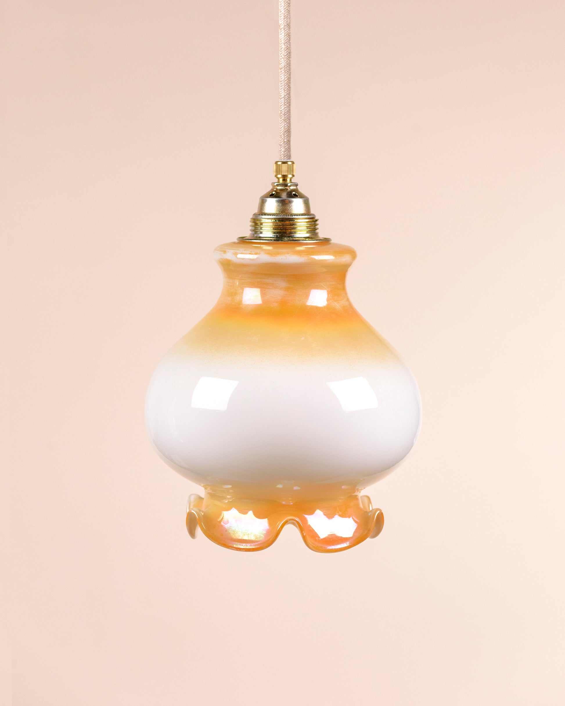 Het vintage lambje Eloïse combineert opaline glas met warme, oranje nuances die vloeiend overgaan in wit. Haar ronde vorm en speelse details maken dit lambje een echte eyecatcher. Het geeft een diffuus licht en voegt een gezellige, retro sfeer toe aan elke kamer.