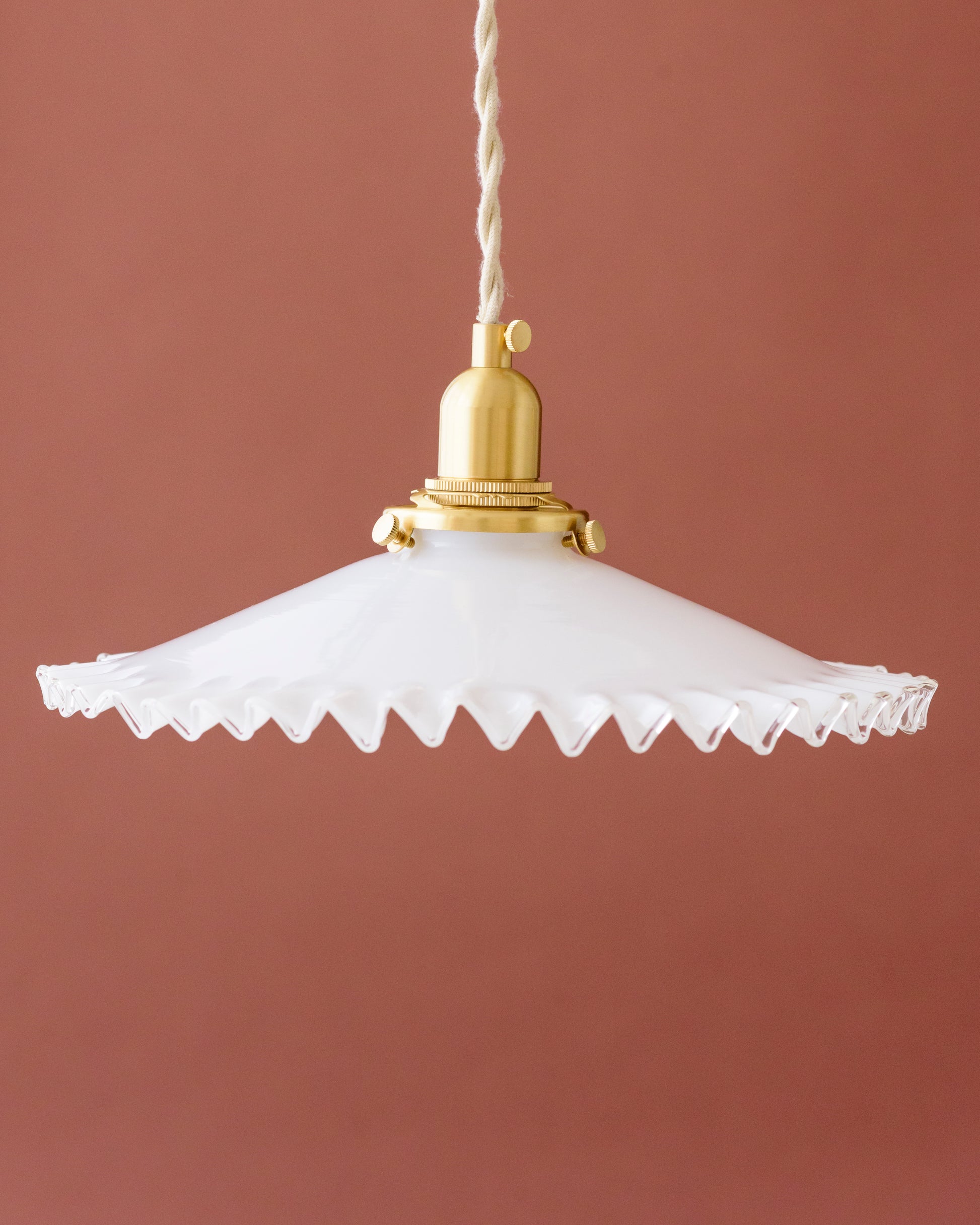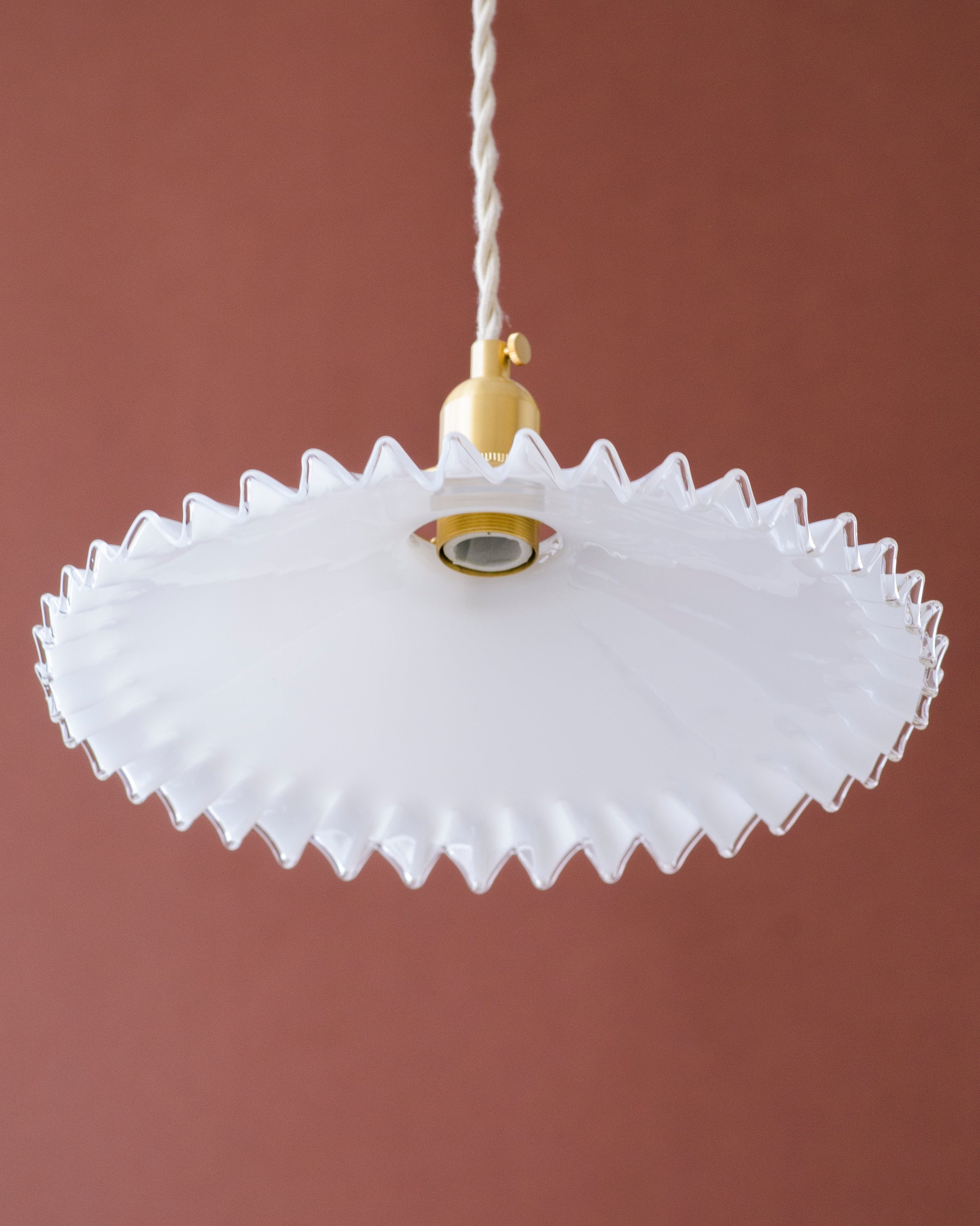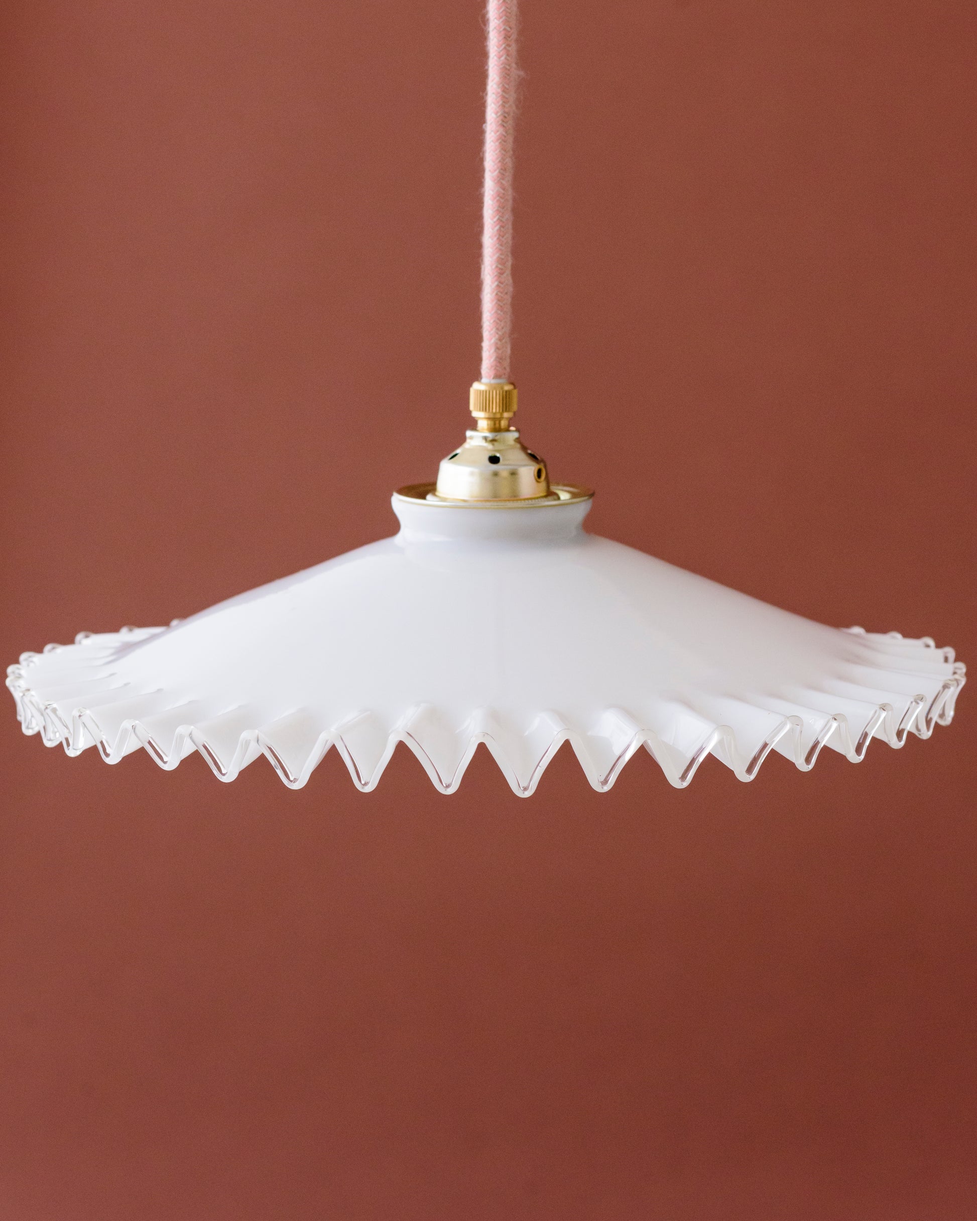 Eveline heeft een klassieke, brede kap met een golvende rand van helder glas. Het opaline glas zorgt voor een warme, diffuse lichtverdeling. Een ideale keuze voor een woonkamer of slaapkamer met een vintage sfeer.