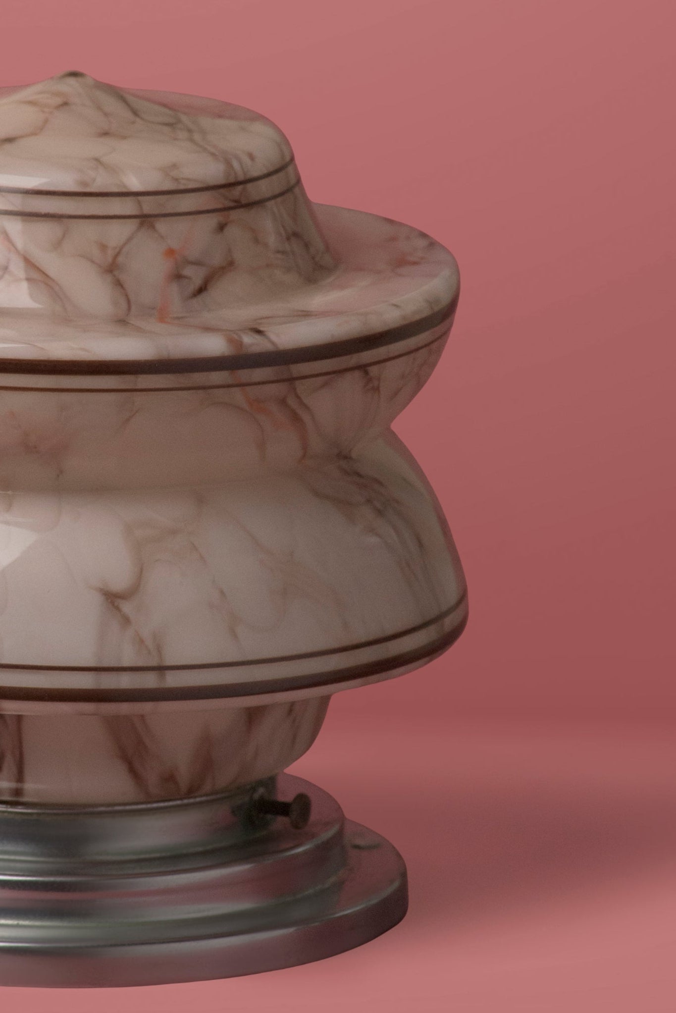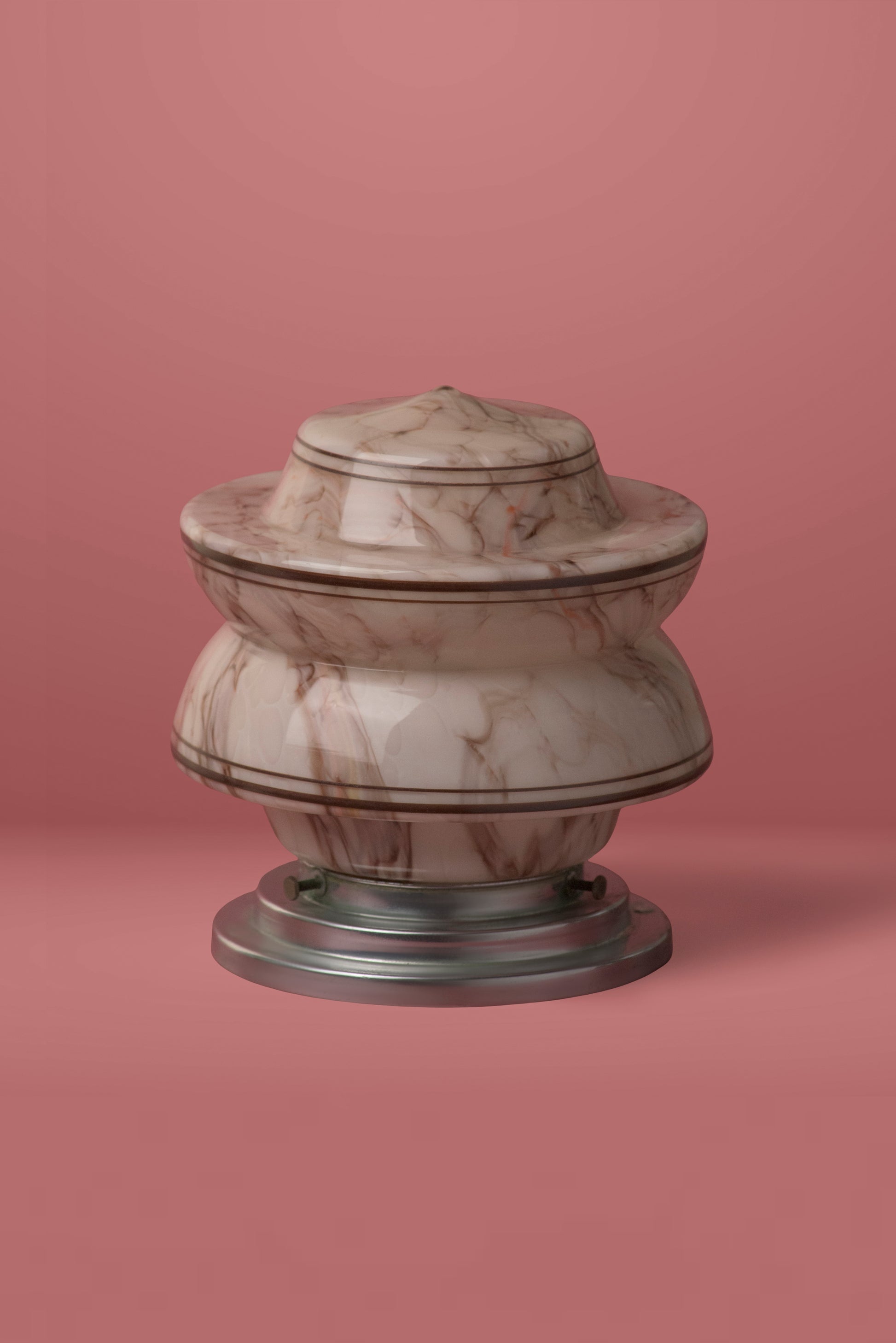 Het lambje Fabienne ademt grandeur. Met haar brede schijfvormige lagen, vloeiende lijnen en warme gemarmerde glasstructuur is ze een klassiek voorbeeld van de expressieve stijl uit de jaren 30. Het beige opaline glas is subtiel dooraderd met roodbruine lijnen die diepte en beweging aan het oppervlak geven. Door haar gelaagde vorm verspreidt ze het licht als een zachte gloed over de ruimte. Fabienne is stijlvol en gedurfd, een karaktervolle toevoeging aan elk interieur dat een beetje magie kan gebruiken.