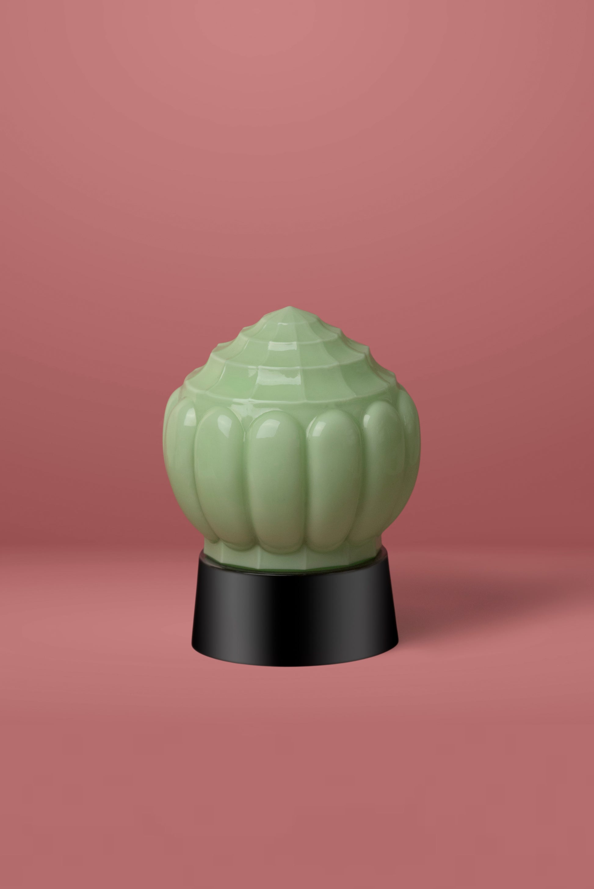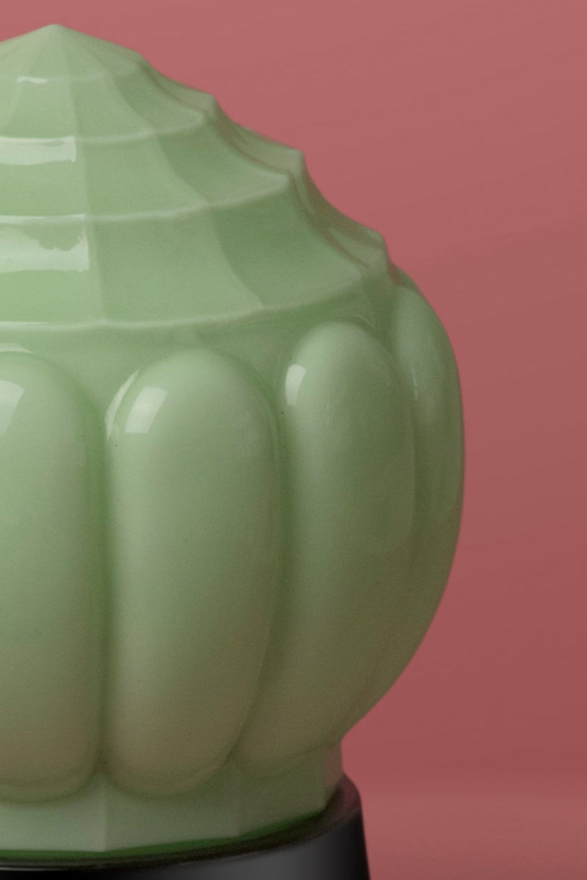 Het lambje Giselle is een verfijnd stukje glaswerk uit de jaren 30, met een opvallend gewelfde vorm die doet denken aan een snoepje of slagroomtoef. Het pistachekleurige opaline glas is glad en glanzend, en de zachte bollingen zorgen voor een lichtspreiding die zowel speels als warm aanvoelt. De licht opwaartse punt in het midden geeft haar een subtiele elegantie. Giselle voelt zich thuis in een zacht interieur, of juist als kleuraccent in een strakke setting.