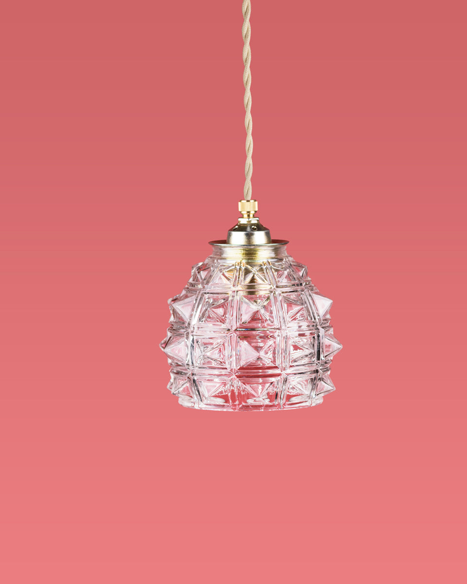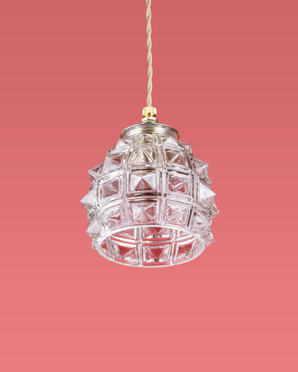 Het lambje Hélène is een expressief ontwerp uit de jaren 60, met een krachtige structuur van helder glas in een opvallend geometrisch patroon. De diamantachtige vormen zorgen voor een levendig spel van licht en reflectie zodra het lampje aangaat. Dit compacte maar karaktervolle lambje is perfect als eyecatcher boven een nachtkastje, in een smalle hal of als stoer accent in een speels interieur met vintage invloeden.