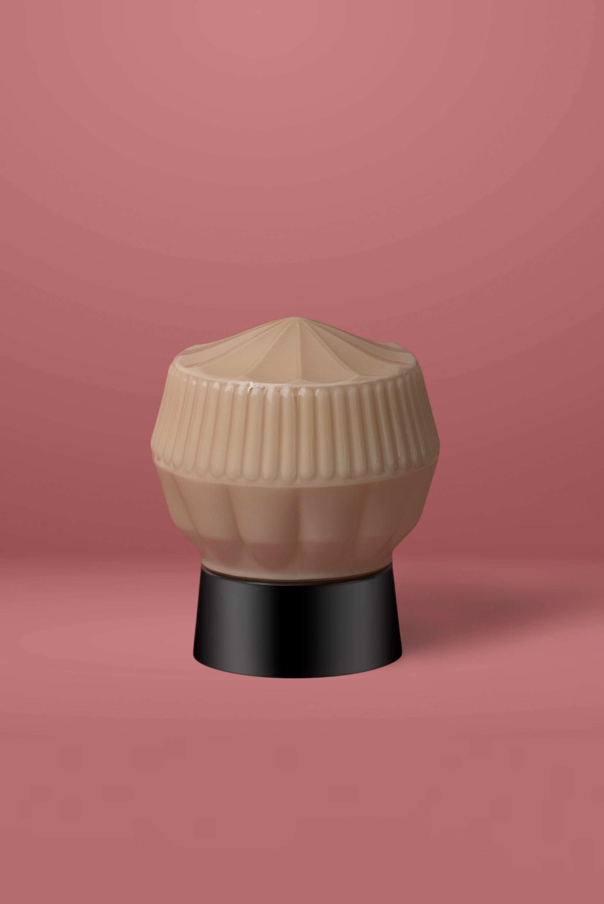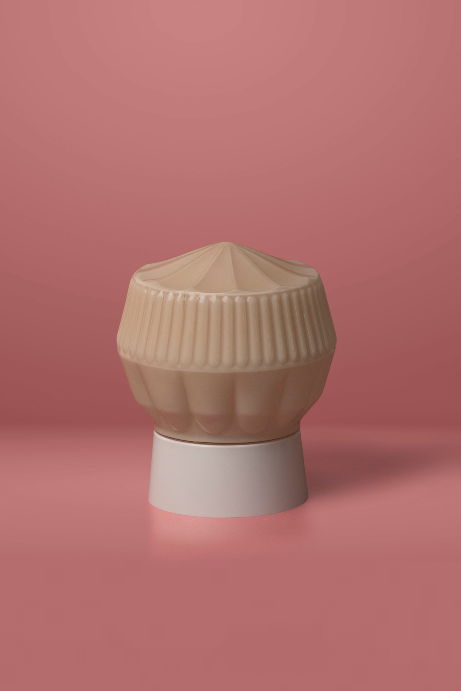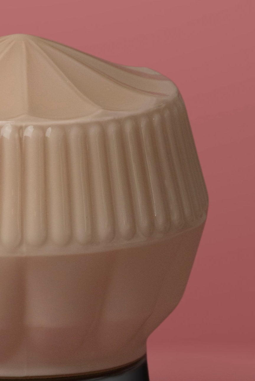 Het lambje Hortense is een ingetogen eyecatcher uit de jaren 50. De kap is vervaardigd uit zacht, opaline glas in een warme nude kleur en heeft een vorm die doet denken aan een klassieke patisserie-vorm: rond, geribbeld en met een sierlijk puntig dakje. Het glas heeft een melkachtig karakter dat het licht diffuus en sfeervol verspreidt. Dit lambje straalt rust uit, maar heeft door haar bijzondere vorm en kleur een uitgesproken karakter. Ideaal voor wie subtiel wil opvallen.