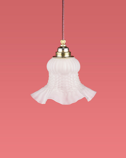 Het lambje Lorraine is een verfijnd ontwerp uit de jaren 20, geïnspireerd door de sierlijke vormen van de Art Nouveau-periode. De subtiele textuur en delicate golvende rand geven dit lambje een zachte en romantische uitstraling. Het matte glas zorgt voor een diffuse lichtverspreiding, waardoor een warme en sfeervolle ambiance ontstaat. Dit charmante lambje komt prachtig tot zijn recht in een klassieke slaapkamer, hal of als decoratief accent in een knusse woonruimte.