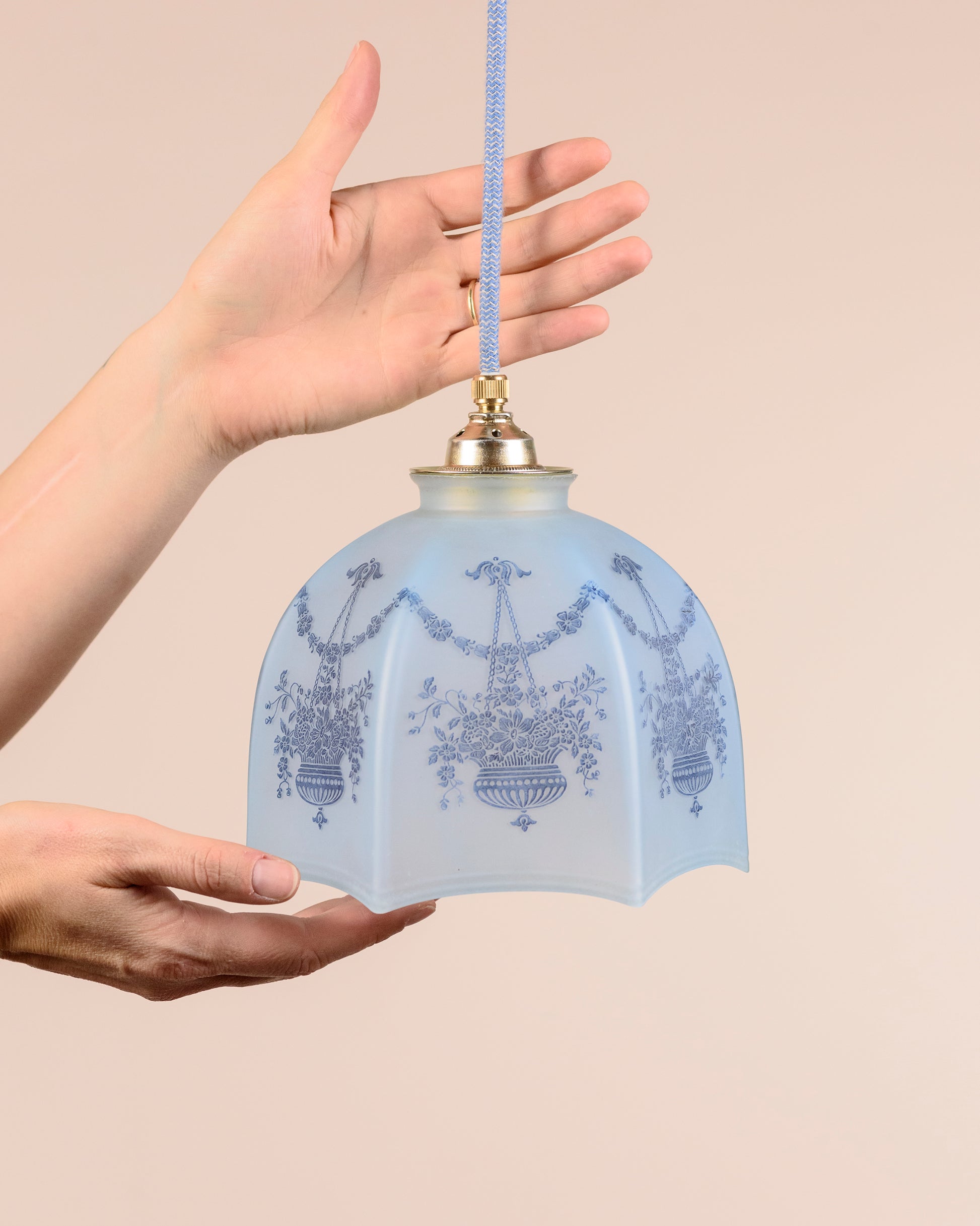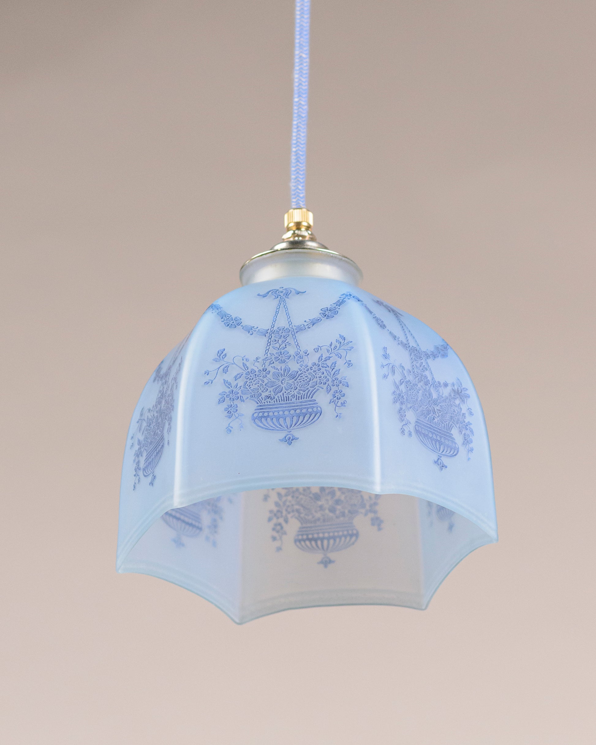 Het lambje Josette heeft een charmante vintage uitstraling met gedetailleerde blauwe bloemmotieven op zacht opaline glas. De subtiele golfvormige rand voegt een extra vleugje elegantie toe. Dit lambje verspreidt een warm diffuus licht en is perfect voor een romantische slaapkamer of een stijlvolle woonkamer.