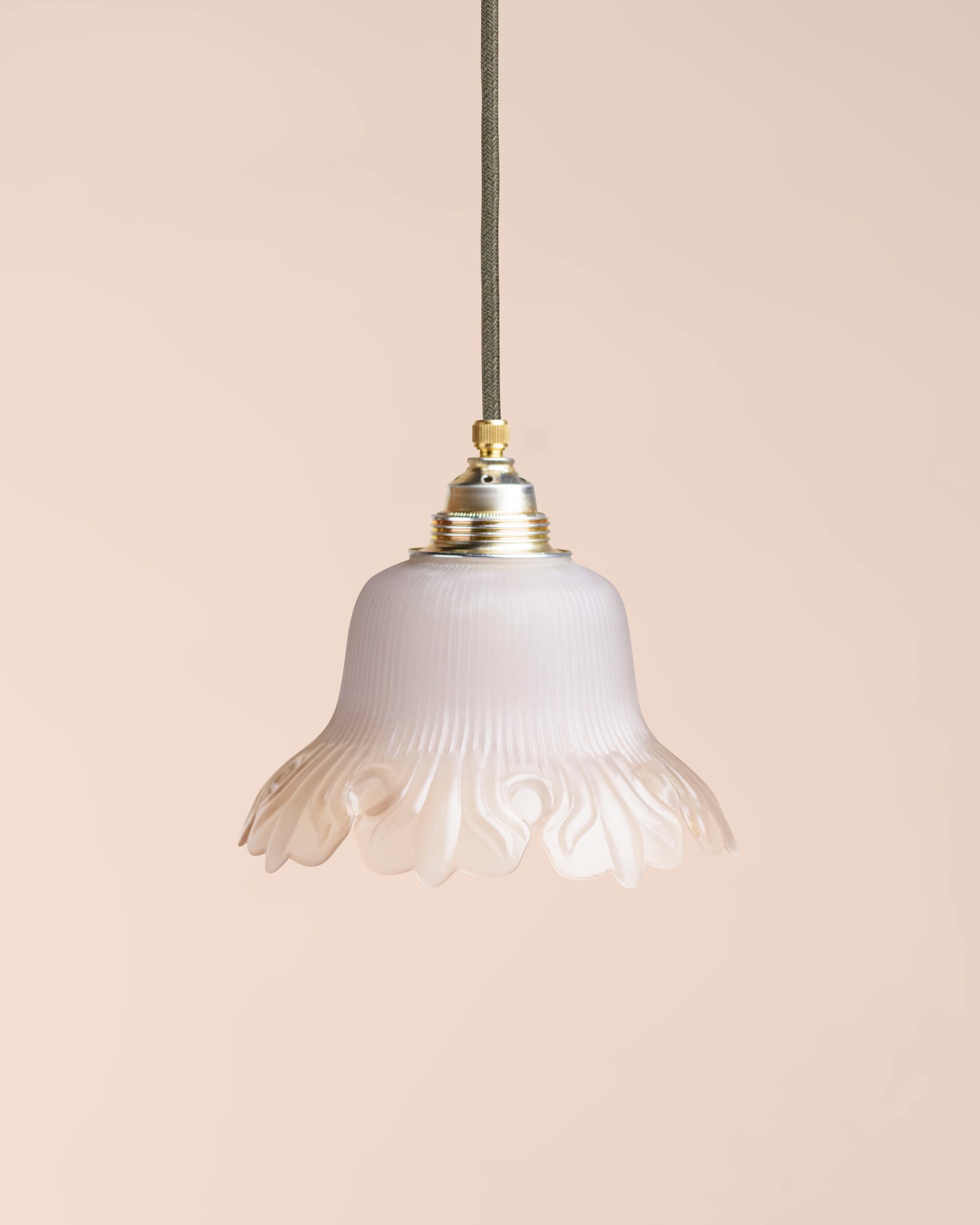Het lambje Noémie is een elegant Art Nouveau-ontwerp uit de jaren 20, met een verfijnde belijning en sierlijke golvende rand. De subtiele ribstructuur in het matte glas geeft het een klassieke uitstraling, terwijl de roze accenten aan de onderzijde zorgen voor een speels lichteffect. Dit romantische lambje verspreidt een warm en diffuus licht, ideaal voor een sfeervolle hal, een knusse leeshoek of als subtiel accent in een vintage interieur