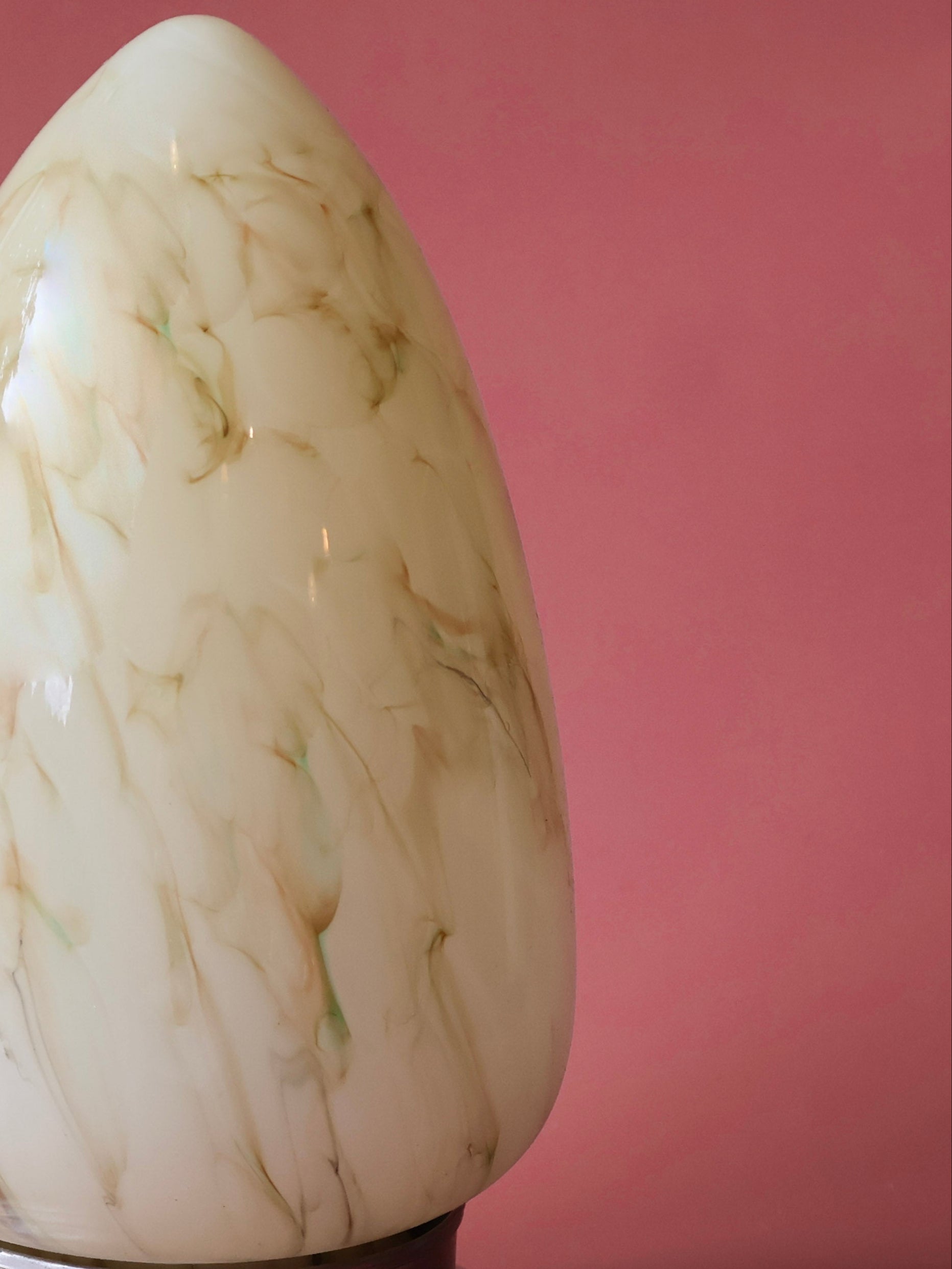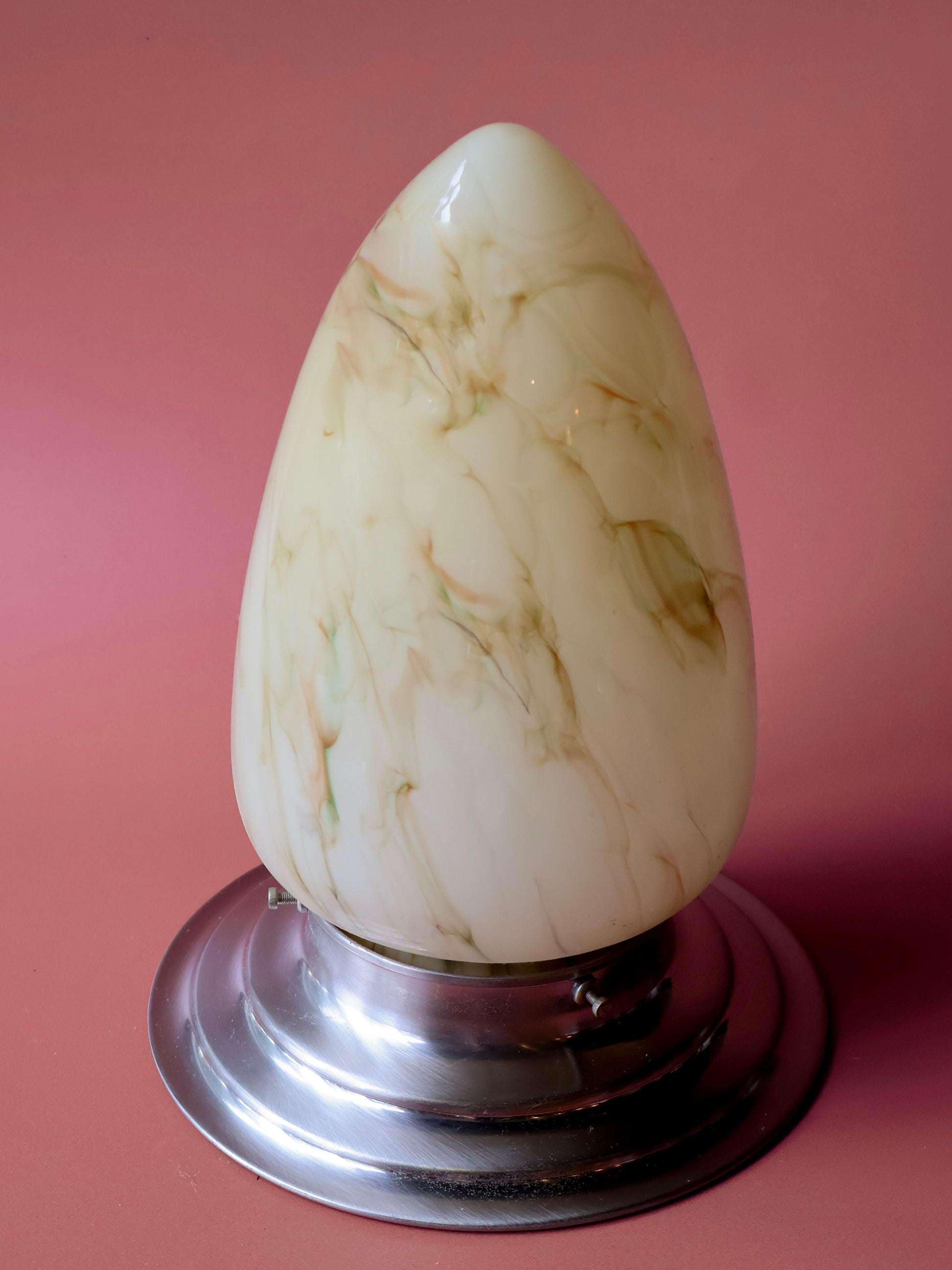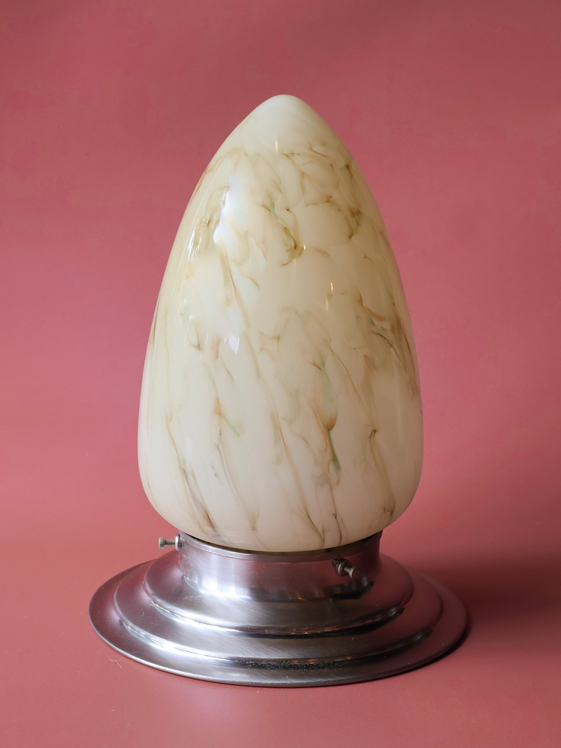 Dit lambje uit de jaren 40 heeft een stevige, druppelvormige kap van gemarmerd glas in een warme beige basistint met subtiele groen-bruine aders. De glans van het glas geeft het geheel een rustige uitstraling die goed past in een natuurlijk of vintage interieur. De chroomkleurige voet zorgt voor een strakke, sobere basis die mooi in balans is met het zachte glas. Beline is geschikt als tafel- of plafondlambje en voegt net wat extra karakter toe zonder te overheersen.