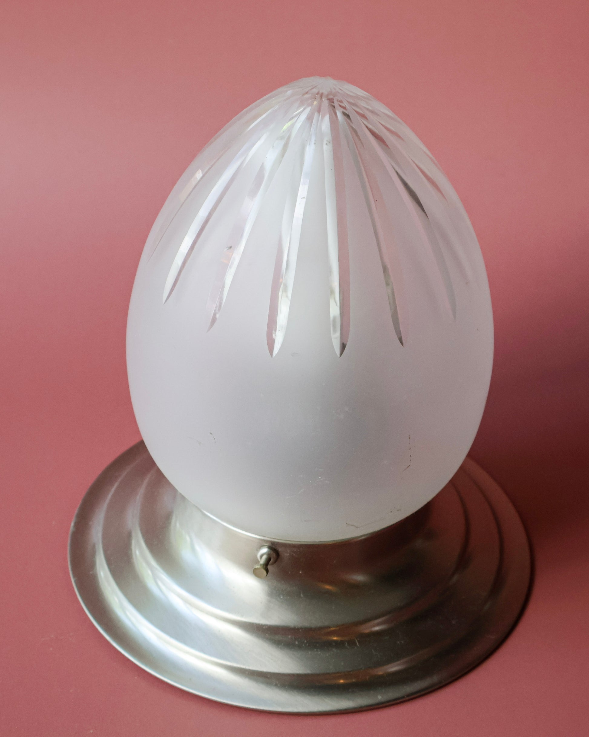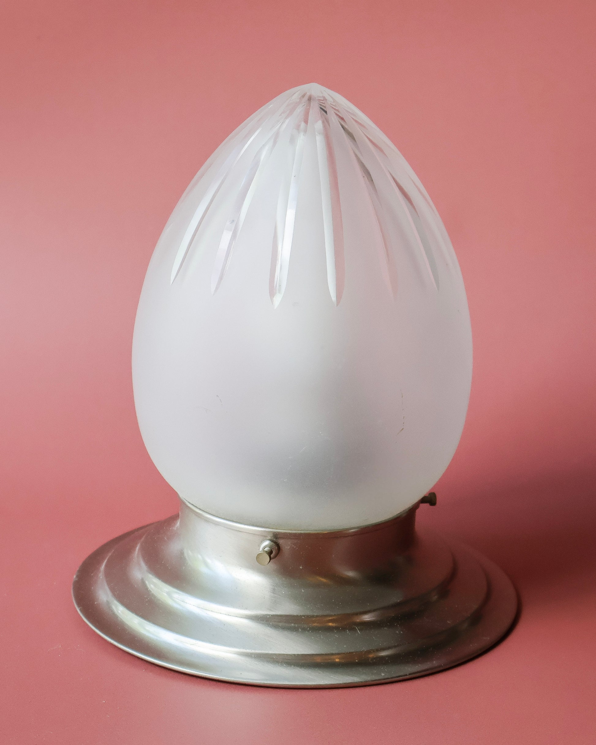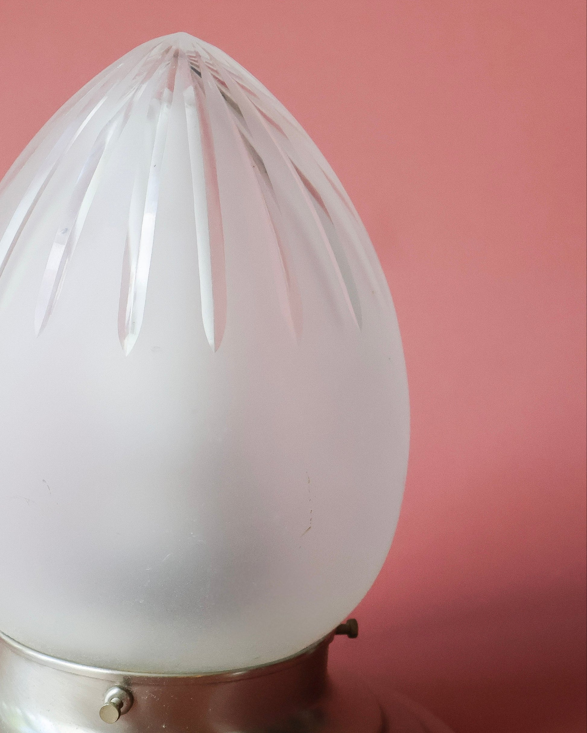 Odalys is een verfijnd lambje uit de jaren 50 met een matte, eivormige kap die subtiel licht verspreidt. De geslepen lijnen bovenop geven net dat beetje extra detail, zonder dat het overheersend wordt. De kap staat op een brede nikkelen voet die zorgt voor een rustige, stevige basis. Ideaal als plafondlamp in een hal of als tafellamp in een rustige hoek van de kamer.