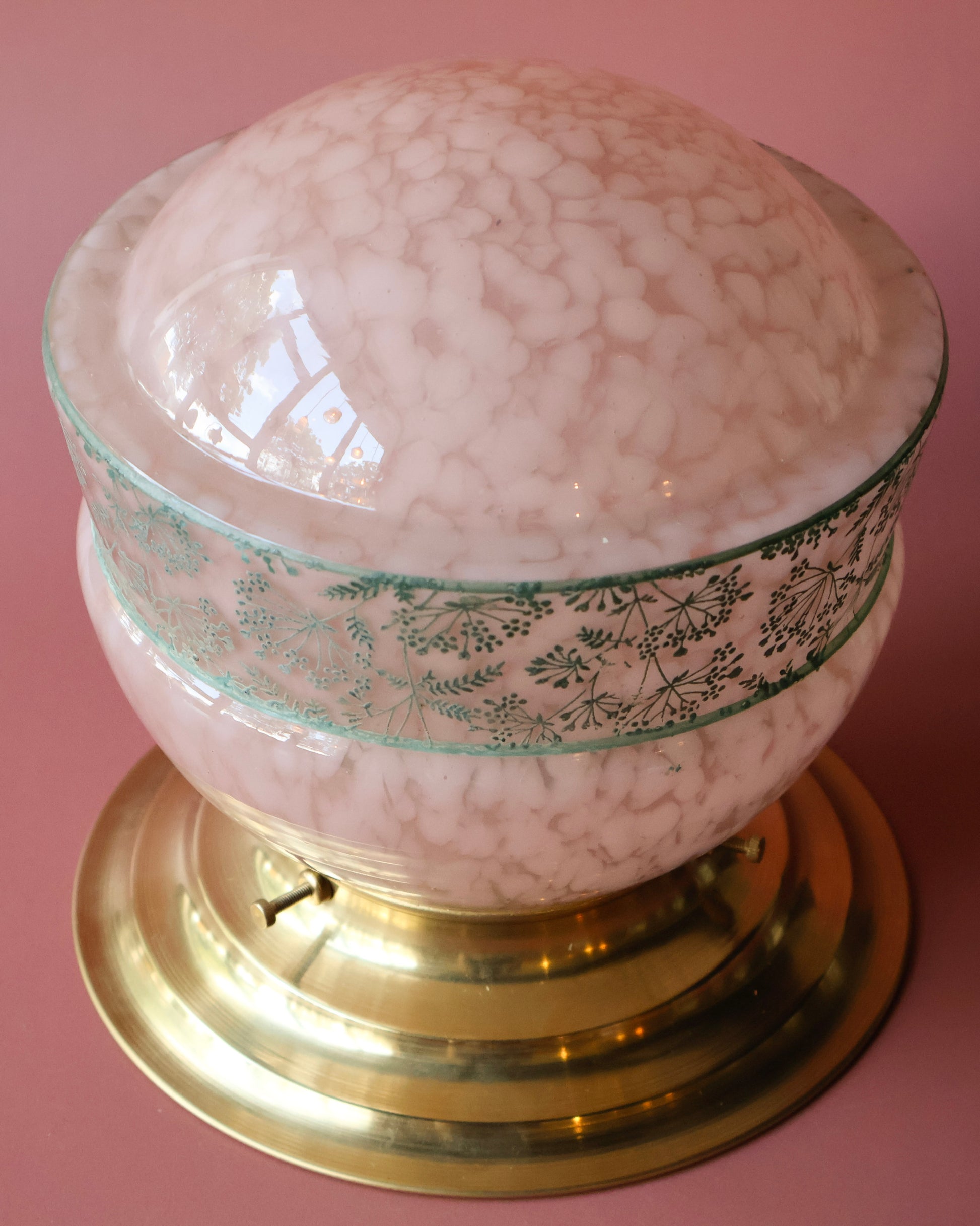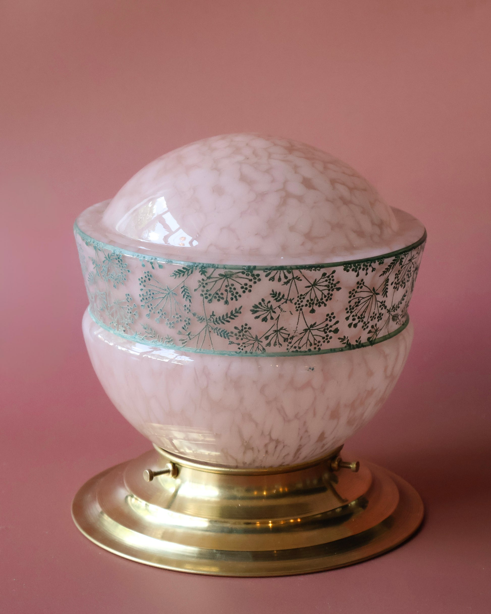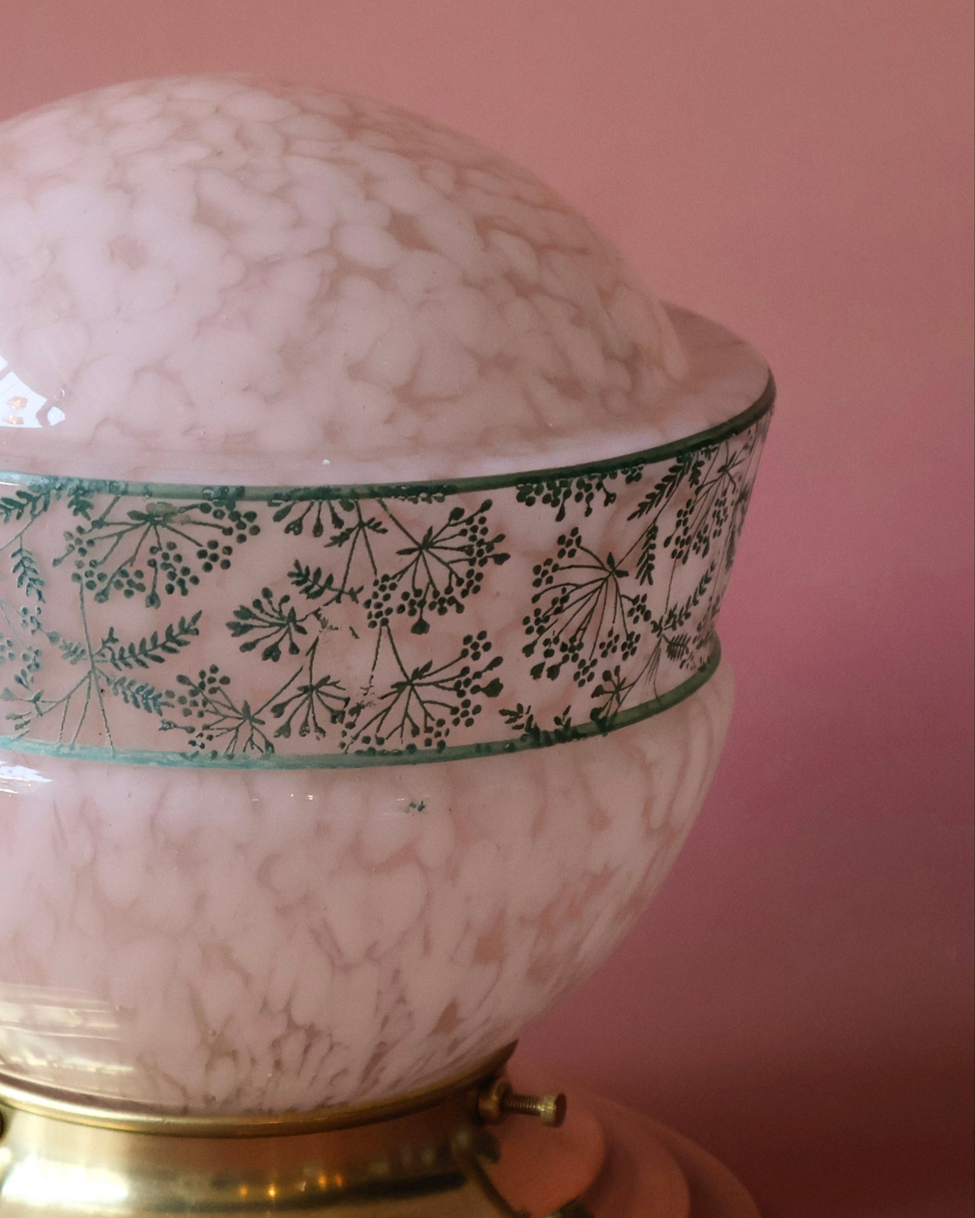 Léontine is een uniek lambje uit de jaren 30 met een bolvormige kap van zacht clichy glas in roze-witte tinten. Rondom loopt een decoratieve groene rand met een fijn bloemen- en kruidenmotief, dat dit lambje een uitgesproken sierlijke uitstraling geeft. De warme koperen voet sluit mooi aan bij de zachte kleuren van het glas en maakt het geheel klassiek maar speels. Een echte blikvanger op tafel of als romantische plafondlamp in een slaapkamer of hal.