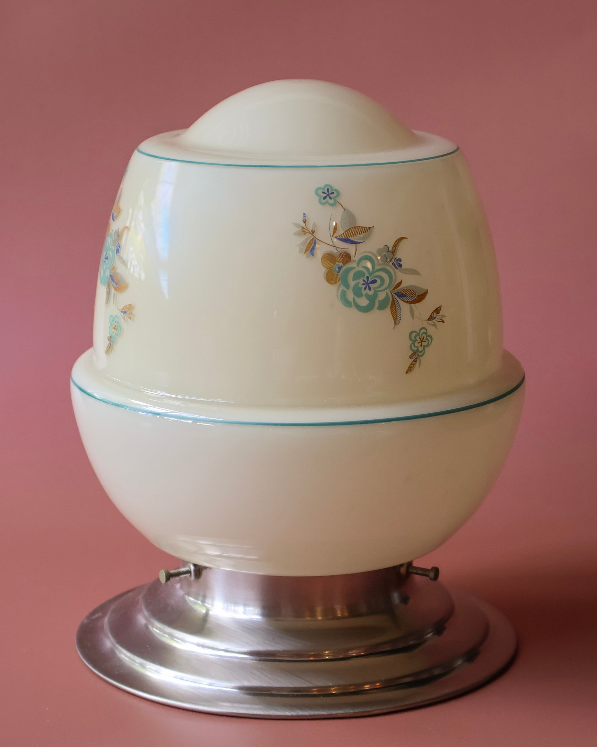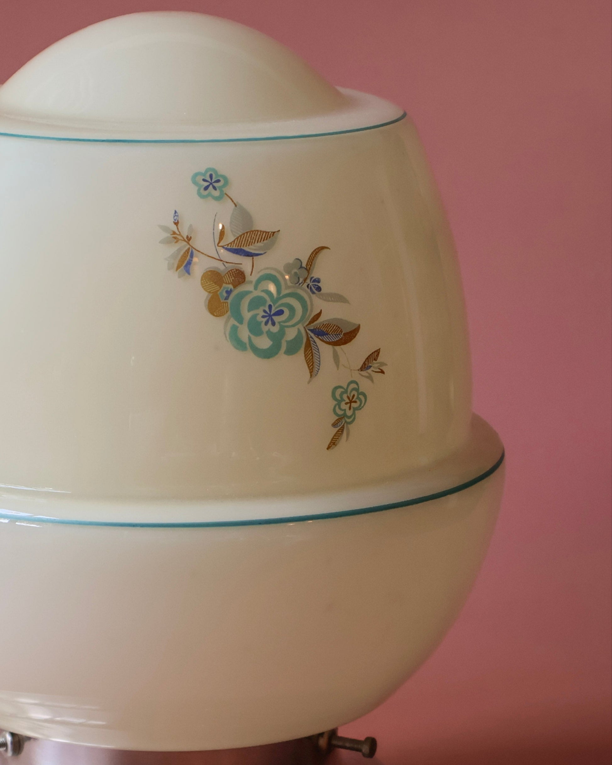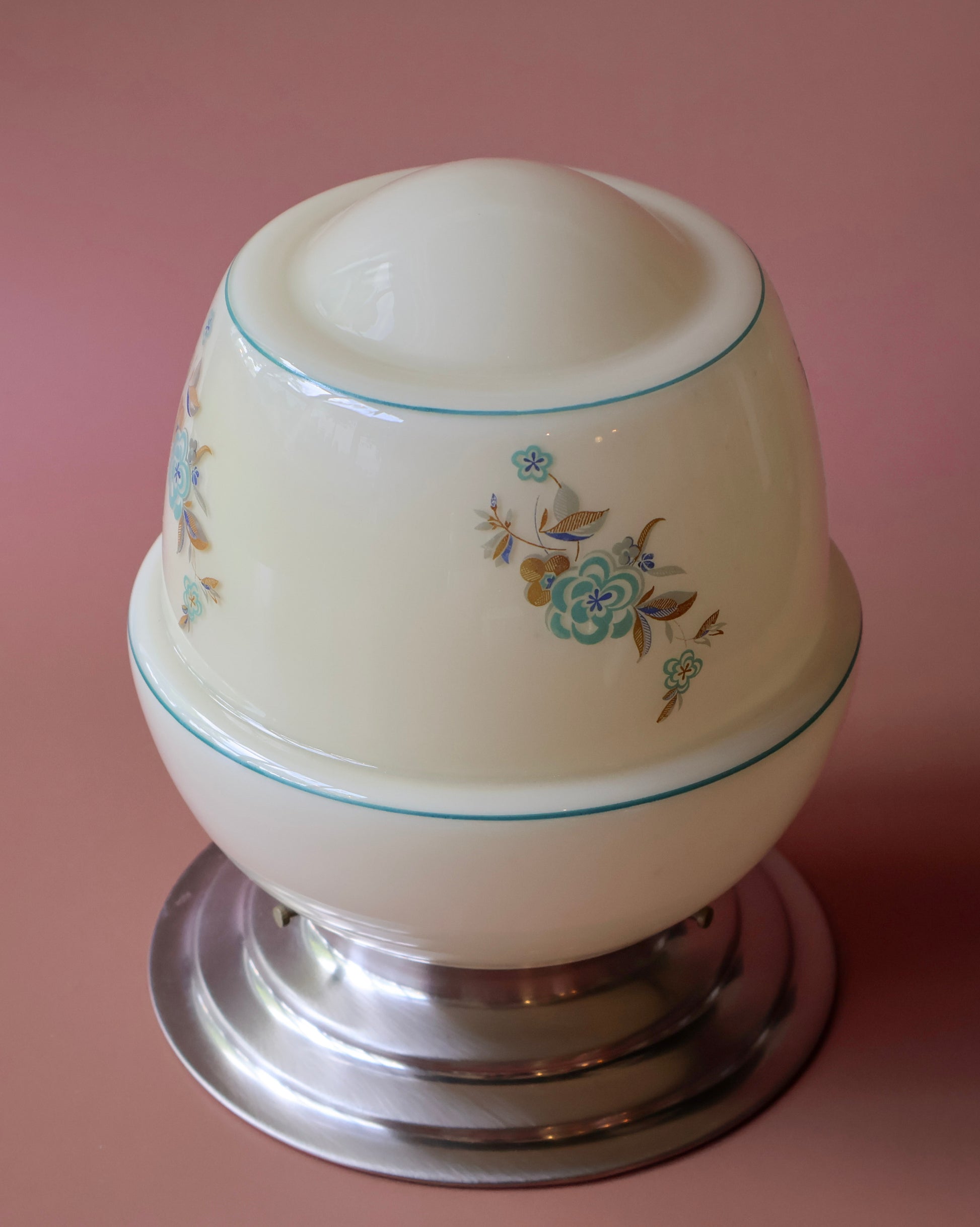 Mirette is een elegant lambje uit de jaren 50 met een ronde kap van zacht opaline glas. De verfijnde blauwe en gouden bloemendecoraties geven haar een sierlijke, bijna oosterse uitstraling. De subtiele turquoise belijning langs de randen zorgt voor extra detail zonder te overheersen. De chromen voet maakt het geheel strak en licht, waardoor Mirette zowel als plafond- of tafellamp goed tot haar recht komt in een romantisch of licht retro interieur.