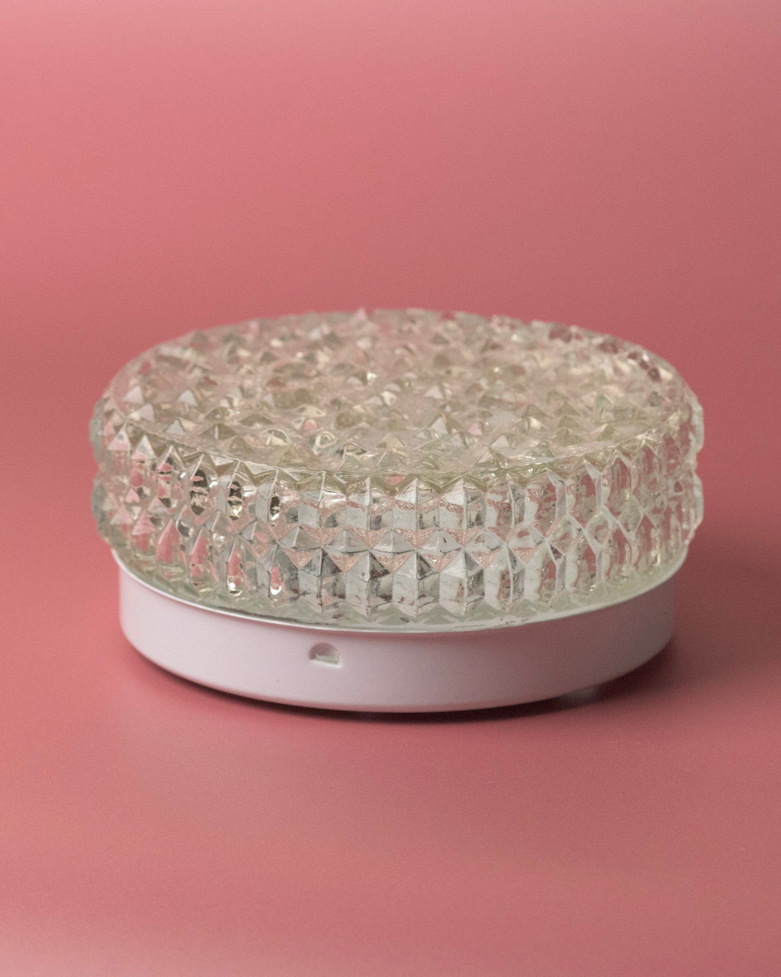 Giselle is een compacte plafonnière uit de jaren 60 met een kap van helder geperst glas in een uitgesproken ruitstructuur. Het glas breekt het licht op een speelse manier en geeft een verrassend helder en sprankelend effect. De witte metalen plafondbevestiging zorgt voor een rustige, neutrale afwerking. Door haar formaat is Giselle ideaal als plafond- of wandlambje in een hal, toilet of boven een nachtkastje.