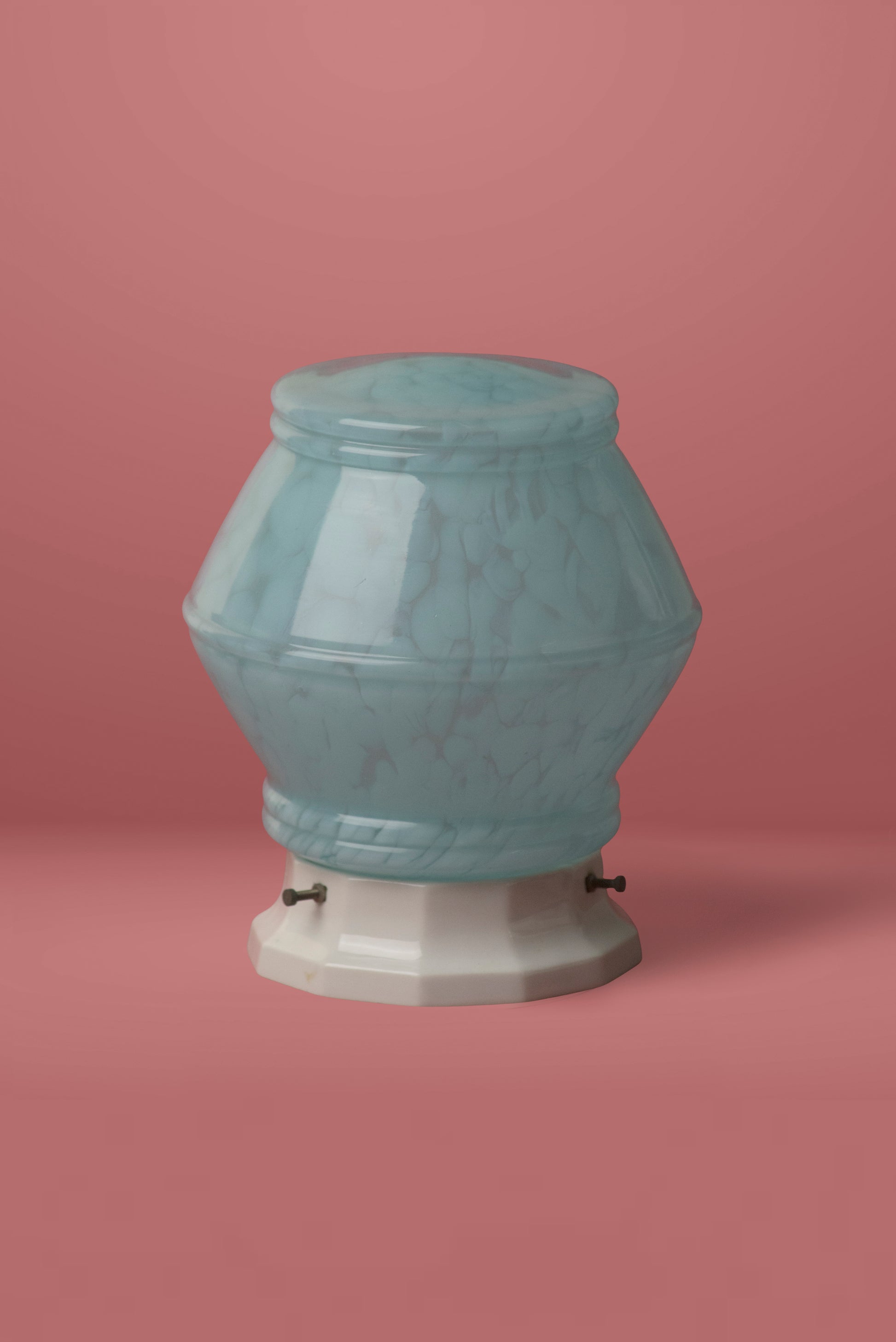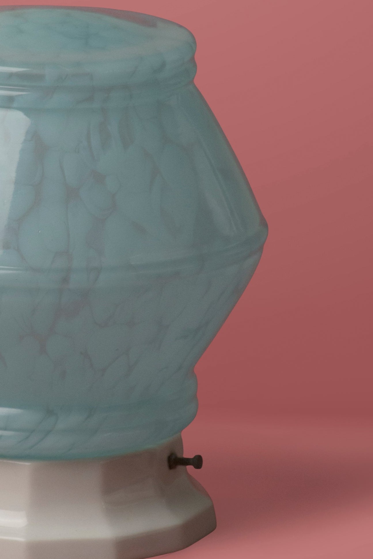 Het lambje Rosaline is een elegante combinatie van verfijning en vakmanschap uit de jaren 30. De glazen kap is gemaakt van karakteristiek Clichy-glas in een zachte marmerblauwe tint, herkenbaar aan de subtiele aders en het levendige patroon. De vorm is krachtig en geometrisch, met afgeronde hoeken en strakke lijnen. Wat Rosaline bijzonder maakt, is haar originele keramieken voet, die stevig contrasteert met het fragiele glas en het geheel een verfijnde balans geeft. Een tijdloos lambje dat charme en klasse uitstraalt — van top tot teen.