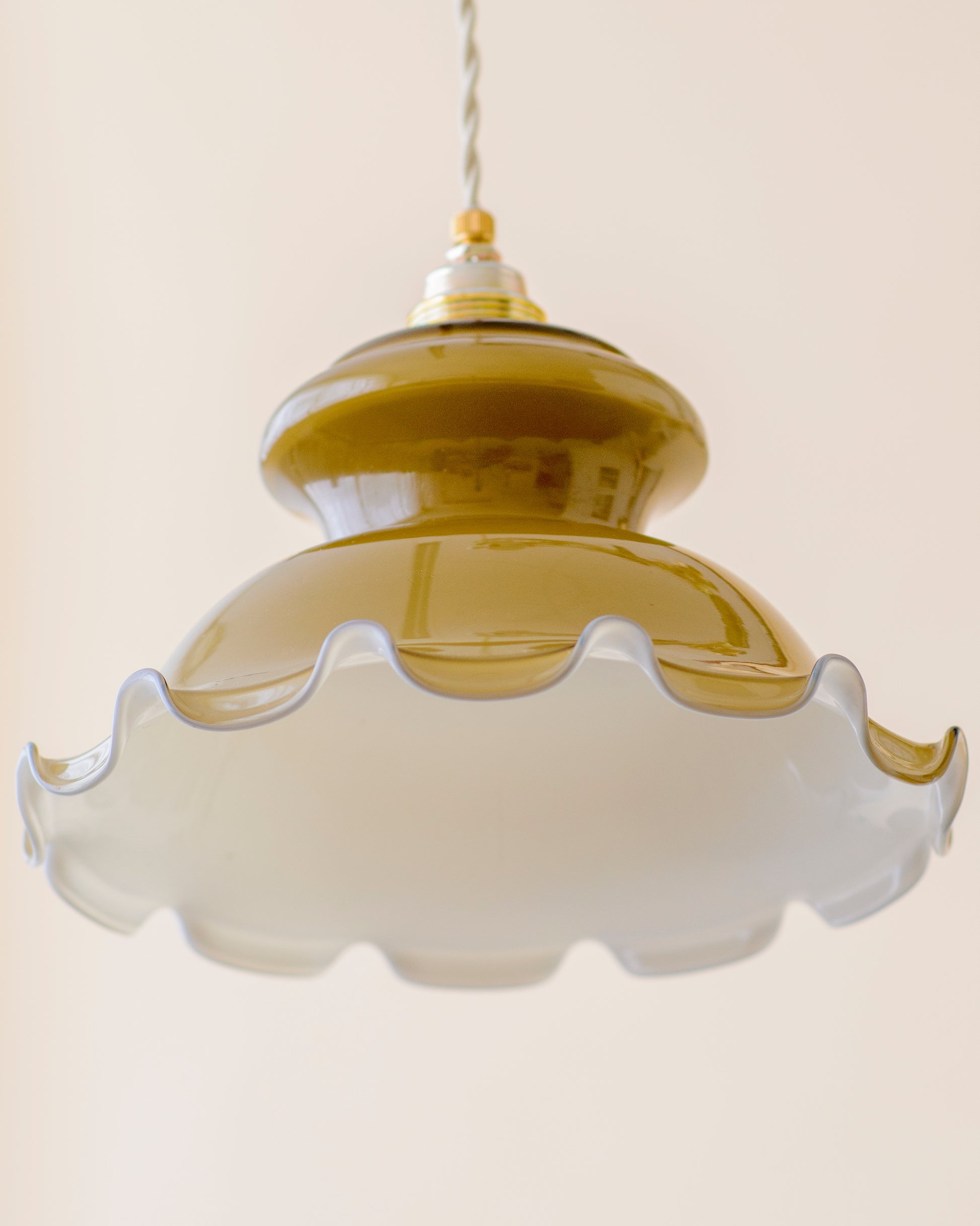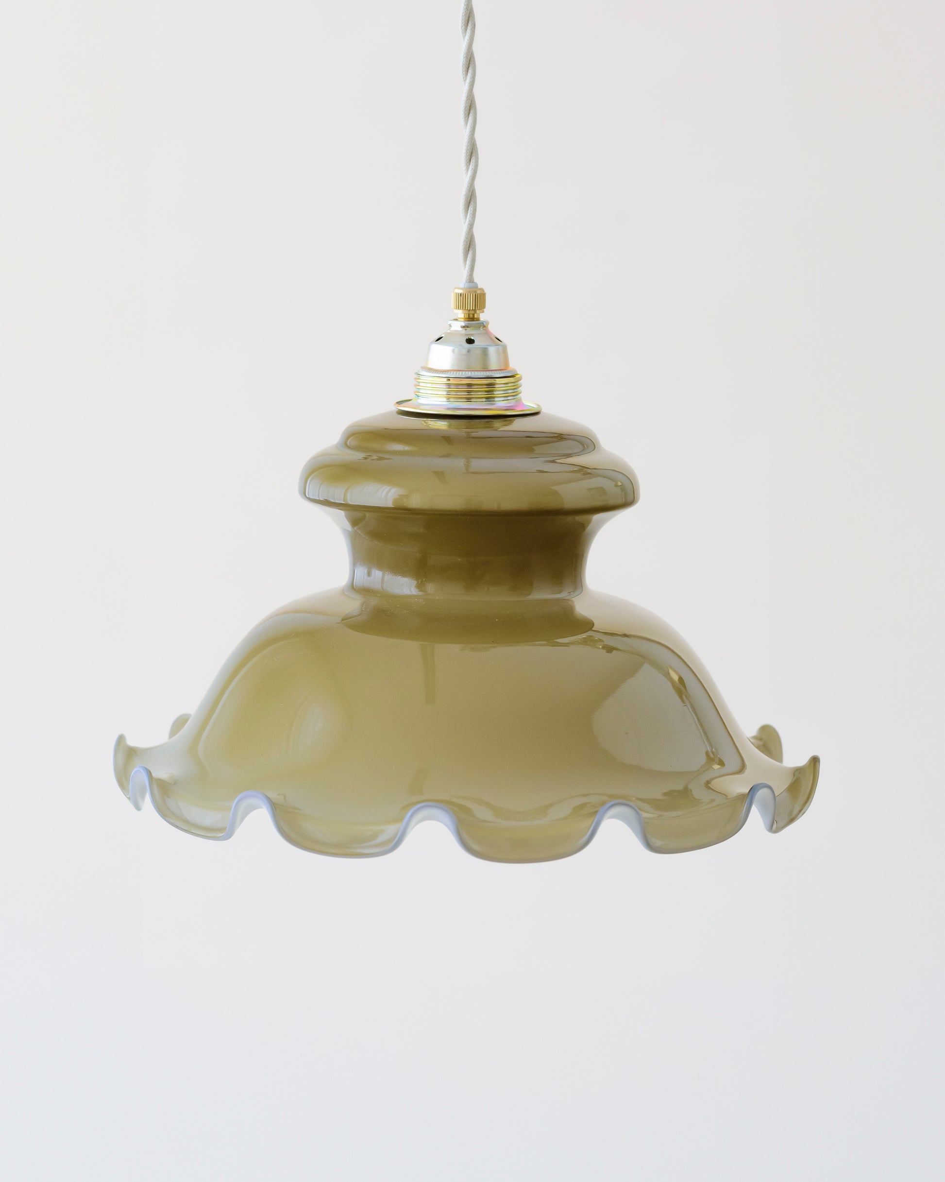 Dit lambje, waarschijnlijk uit de jaren 1920 of 1930, is gemaakt van zeldzaam olijfgroen opalineglas. De kap heeft een elegante, bolvormige top die overgaat in een bredere, golvende rand, wat doet denken aan de Art Deco-stijl van die periode. Het glas verspreidt een zachte, warme gloed en de subtiele kleur en verfijnde vorm geven het lambje een luxe en tijdloze uitstraling.