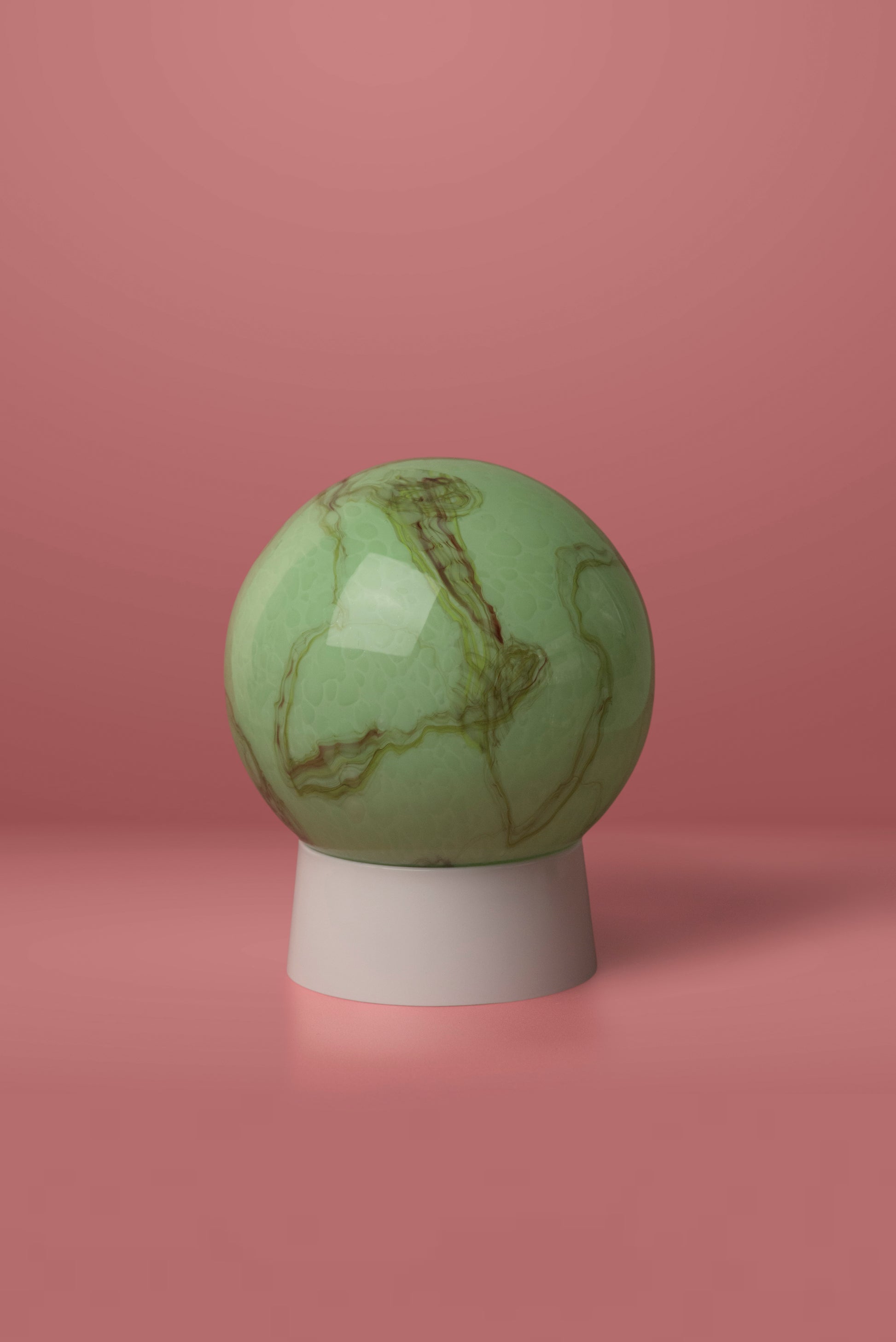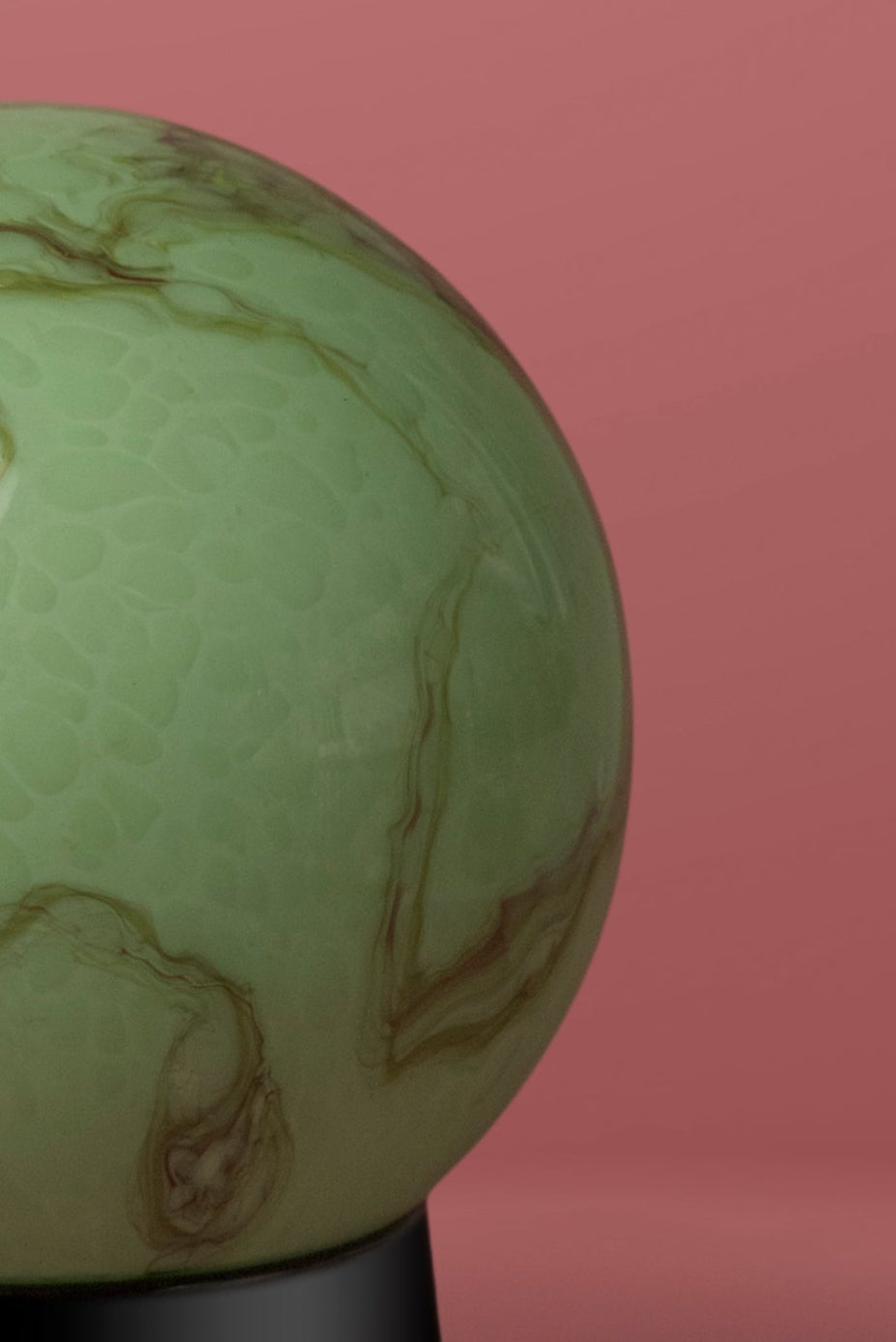 Het lambje Seraphine is een dromerige verschijning uit de jaren 30. De bolvormige kap is gemaakt van jadegroen opaline glas, subtiel gemarmerd met zachte, aardse aders in een warmbruine tint. Het oppervlak heeft een bijna vloeibaar ogende textuur die diepte en beweging in het materiaal brengt. Seraphine is rustgevend en mysterieus tegelijk — als een vintage kristallen bol waarin verhalen tot leven komen. Ze brengt karakter en zachtheid in elke ruimte waar ze mag schitteren.